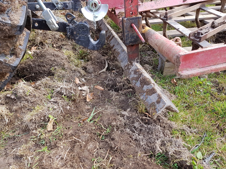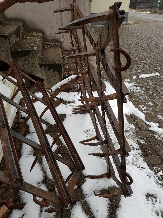 Aktuell habe ich eine alte Ackeregge (2x1,2m) gekauft. Diese will ich nun umdrehen (Zinkenkrümmung gegen Fahrtrichtung). Ein erster Test war auch schon erfolgreich. Die Zinken stehen allerdings alle ziemlich in einer Reihe, was ich mit leichten verdrehen der Zinken noch etwas korrigieren kann.