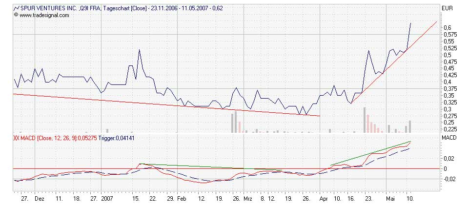 The trend is your friend Technische Indikatoren wie der MACD bestätigen den Kursanstieg. Schonmal dran gedacht nen Stop zu setzen, z.B. ein paar Punkte unter dem letzten Tief bei 0,50 Euro?
