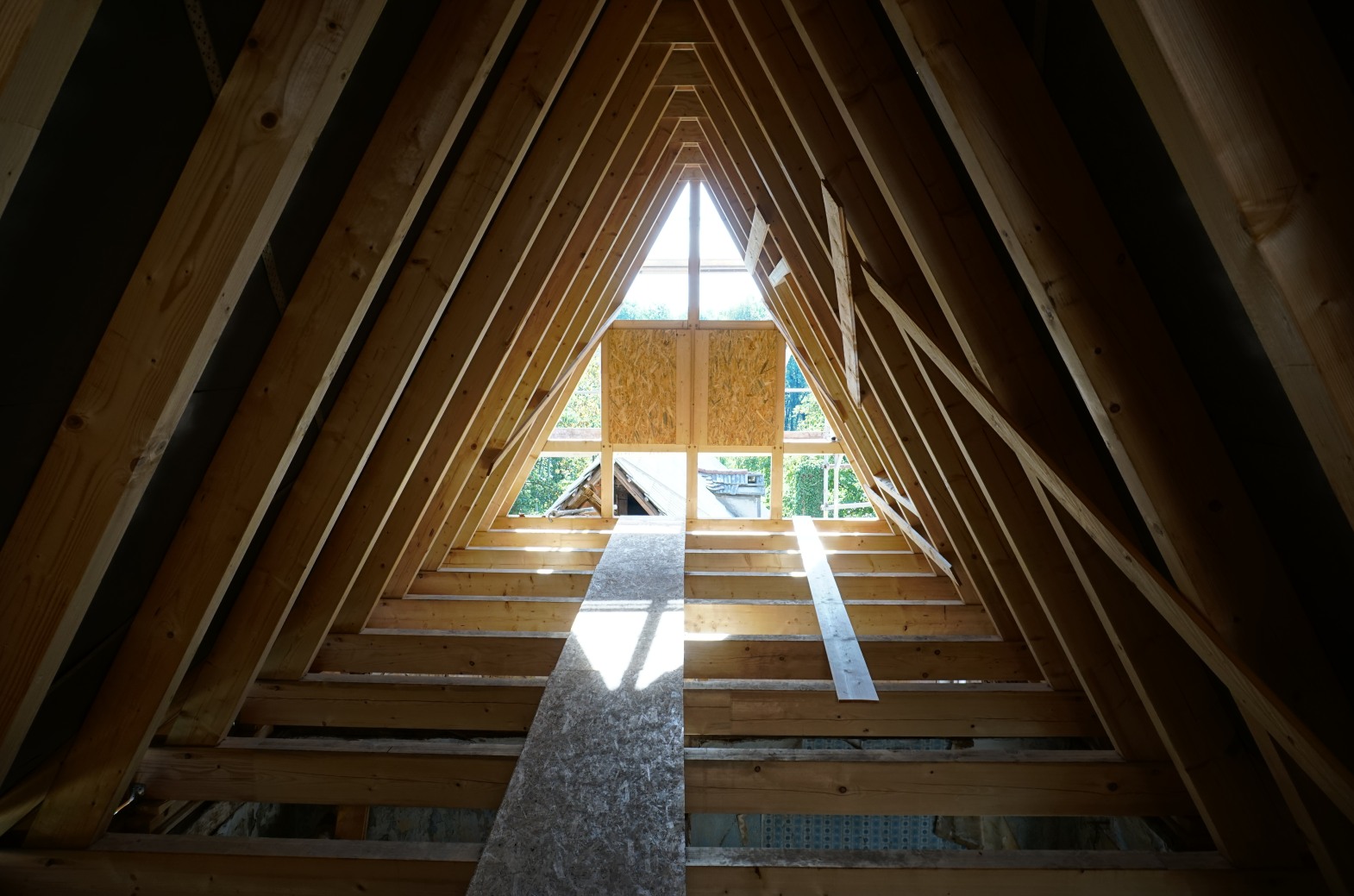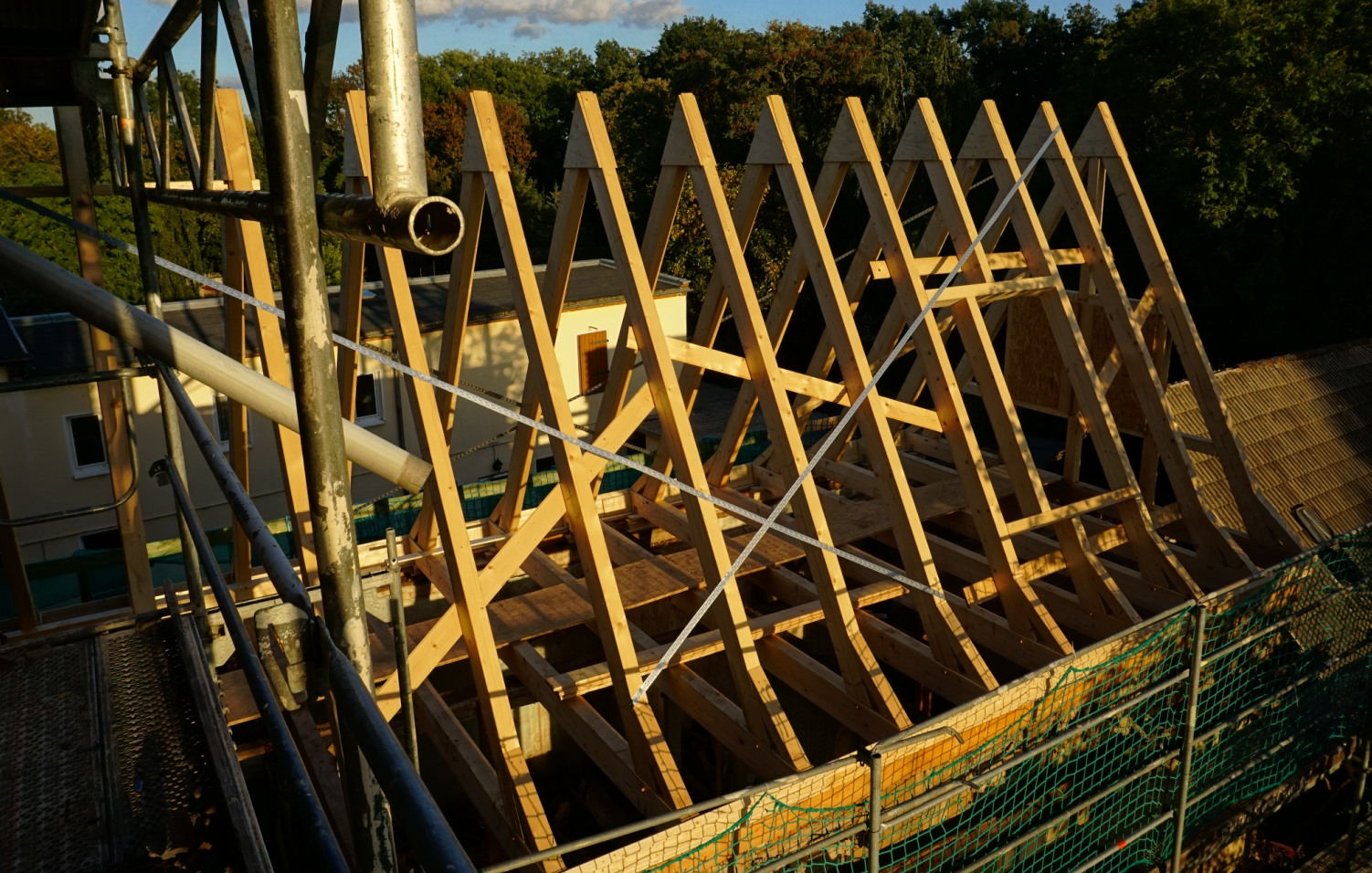 Interessant ist auch die Konstruktion, die sich der Architekt gemeinsam mit dem Zimmermann für das Gerüst an der Rückseite des Seitenflügels ausgedacht hat.