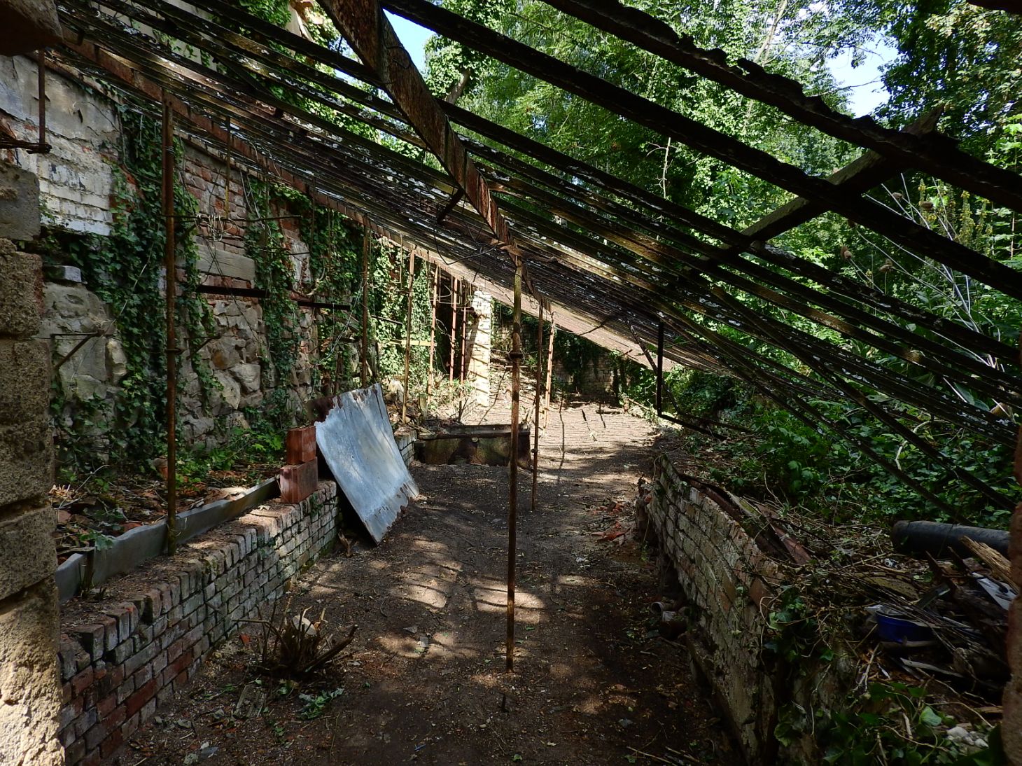 Das Gewächshaus hat mein Urgroßvater gegen 1880 bauen lassen. Damals hochmodern, mit Heizhaus und mehrere Abteilungen. Heute noch ein verrostetes Gerippe, das eigentlich sehr morbide ist und schon deswegen auch faszinierend, aber das auch im Wege steht. Was macht man damit? Ich würde mir ja gern eine Terrasse mit Gartenzugang draus machen.