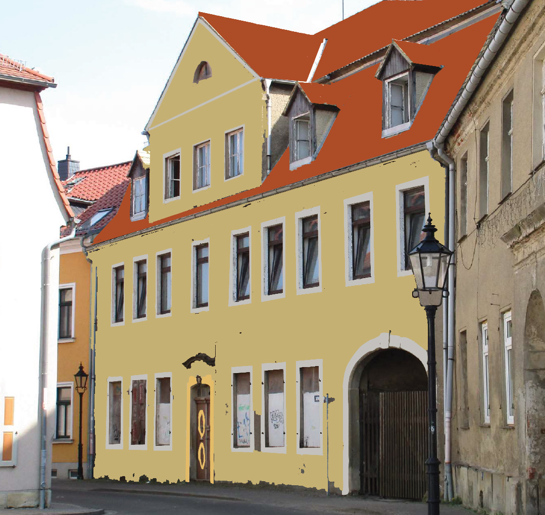 Eure Meinung hat mich motiviert, ein bißchen mit Photoshop rumzuspielen und auszuprobieren, wie diese Variante farbig aussehen könnte. Vor allem geht es mir um die Gestaltung des Giebels und die neue durchgezogene Traufe mit Dachrinne. Dazu noch ein paar graue Gewände um die Fenster.