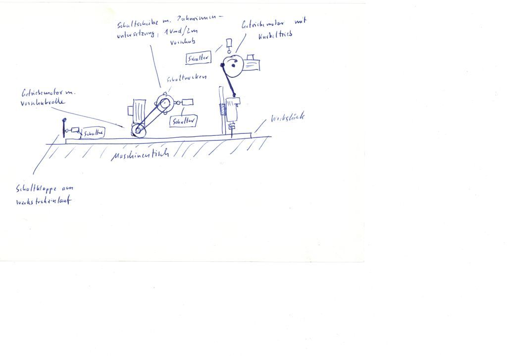 Also soll im Prinzip die Gummirolle das Werkstück vorschieben; die Schaltscheibe dreht sich mit. Wenn ein gewisser Punkt auf der Schaltscheibe erreicht ist (z.B. eine 1/5 Umdrehung), dann soll ein auf der Scheibe angeordneter Nocken einen Schalter betätigen. Der Werstück- Vorschub bleibt stehen, der Vorschubantrieb der Bohrmaschine setzt sich in Bewegung. Die Kurbel mit Pleuel bewegt die Bohrmaschine einmal runter und die wieder hoch in Grundstellung. In der Grundstellung (Bohrmaschine ganz oben) drückt diese auf einen zweiten Schalter. Dieser sorgt dafür, dass der Bormaschinenvorschub wieder still steht und der Werkstückvorschub los läuft. Wenn die Schaltscheibe den nächsten Nocken erreicht, geht es wieder von vorne los.