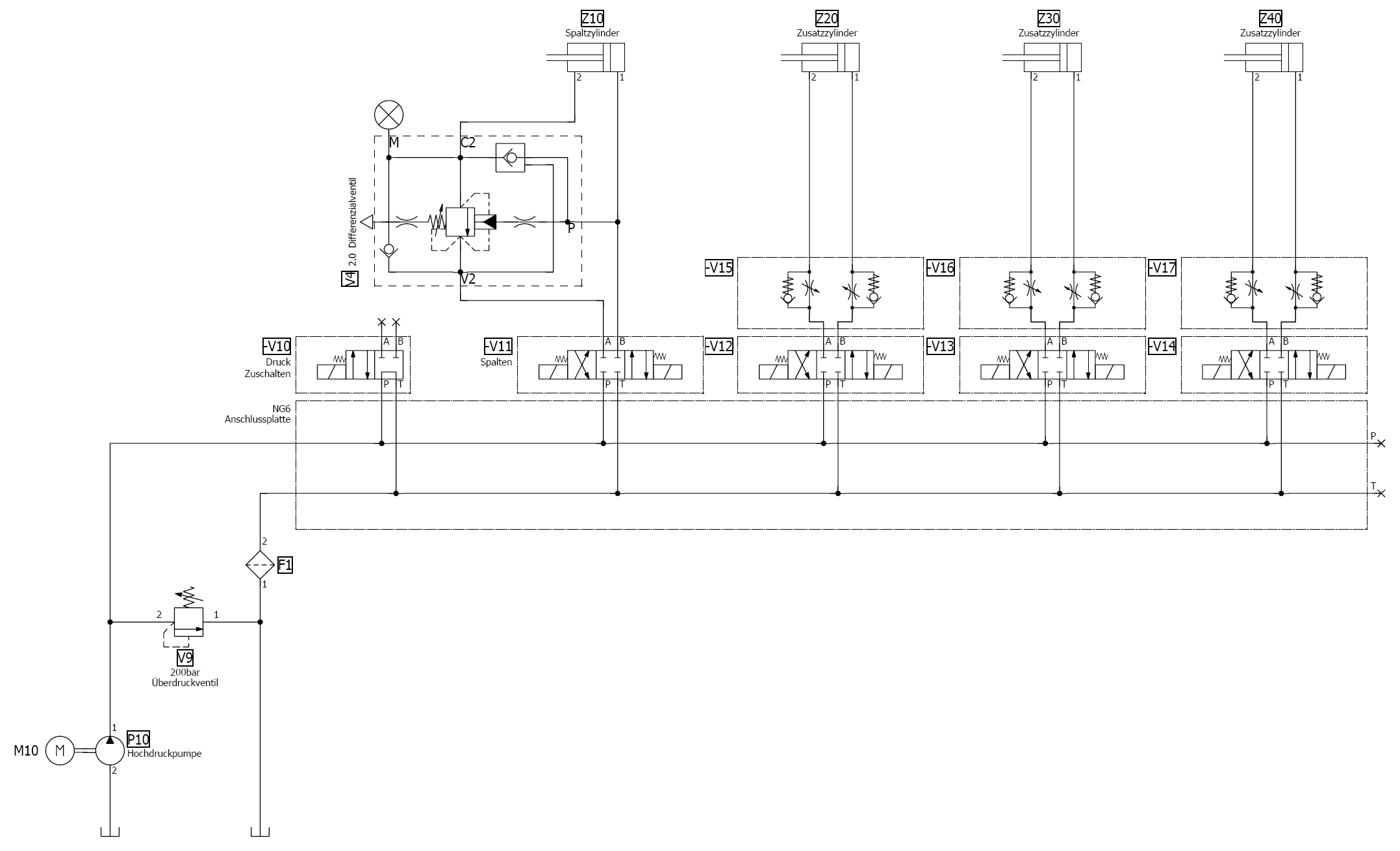 maximaler Systemdruck 200 Bar; sobald ein bestimmter Druck (abhängig von Förderleistung und Antriebsleistung) erreicht wird und am Anschluß X ansteht, fördert die größere Pumpe in den Tank. So weit so gut. Weshalb verwendest du ein Ventil mit Schwimmstellung? Durch das Eigengewicht der Kolbenstange und dem Keil wird der Zylinder nicht eingefahren bleiben (ich geh mal von einen Senkrechtspalter aus). Du solltest eines nehmen mit drucklosen Umlauf und die Anschlüsse A und B gesperrt. Ob das Differentialventil Sinn macht, müßte man mal genau ausrechnen. Denn wenn dein DAV die große Pumpe aus dem System wirft, brauchst du die Motorleistung für den Druck. Der Eilgang wird dann wohl auch nicht zuschalten...