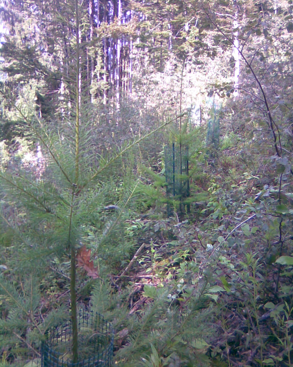 Ich habe aber auch Douglasienanpflanzungen in der Freifläche. Ich pflanze immer auf Reihe und nach System, meist in Endabstand und lasse die Pflanzen einwachsen, ein oder zwei Stöckchen neben die Pflanze gesetzt etwas Astmaterial herbeigezogen oder Wipfelstücke damit die Pflanzen nicht zu stark verfegt werden können - verbeißen ist eigentlich das kleinere Problem - starkes Verfegen am Stamm ist meist tödlich obwohl die Douglasie auch aus noch nicht verfegten Ästen wieder einen schönen Haupttrieb bilden kann. In den folgenden Jahren versuche ich Faulbaum oder Birken so um die Pflanzen zu drapieren, das der Rehbock Mühe hat die Pflanzen zu erreichen.