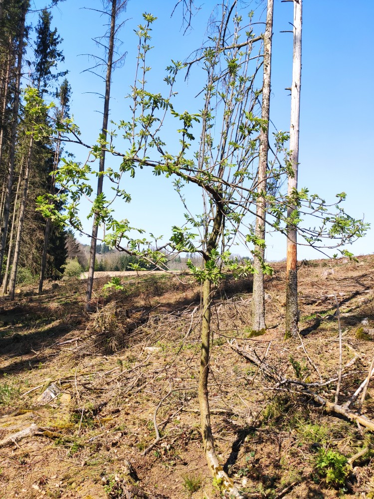 Also wie ich es nun rausgelesen habe, die Vogelbeere als Pionierbaum lassen, wenn was anderes kommt muss die dann gehen. Nicht explizit schützen. Kirsche mal mit Wuchshüllen gegen verbiss schützen? Ansonsten wird bei uns alles weggefressen