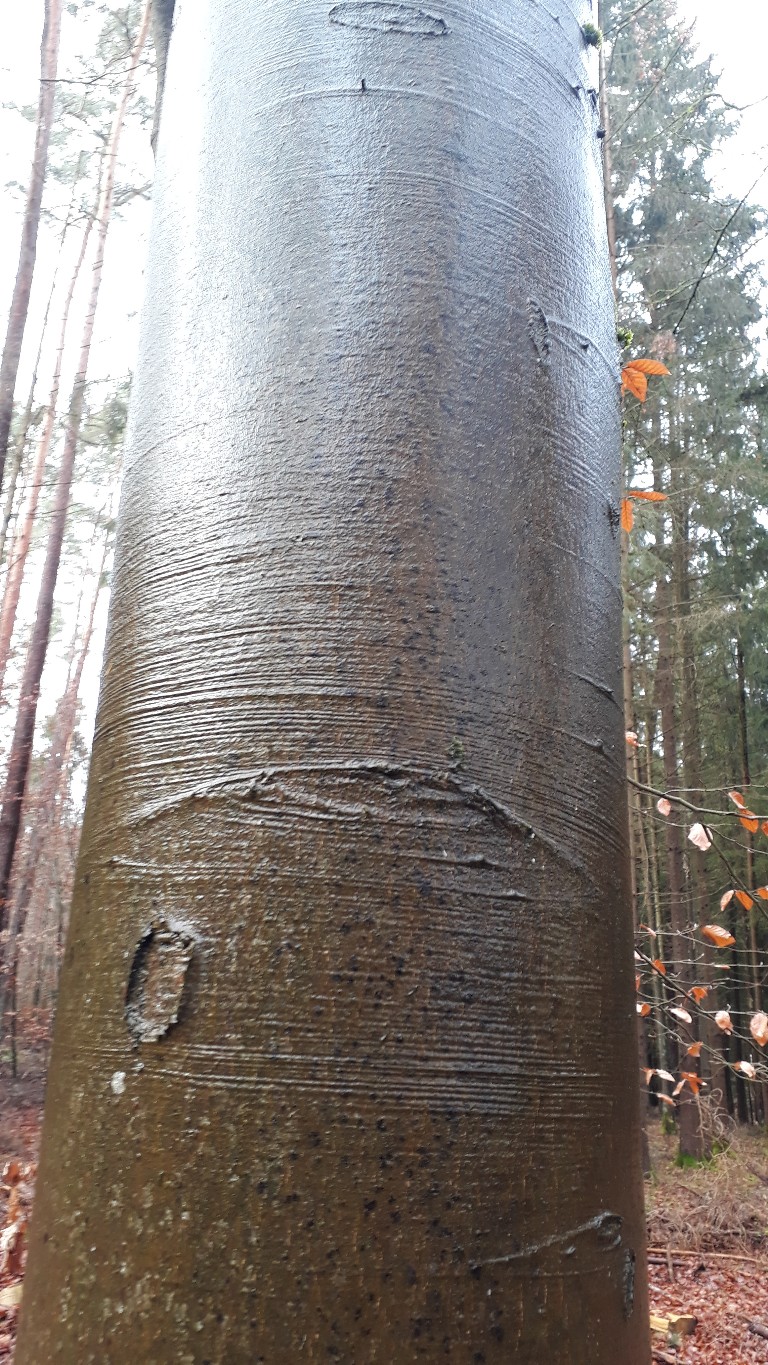 Da vom TE nichts kommt um zur Auflösung beizutragen, stelle ich mal Bilder einer Buche ein, da sie ebenso horizontale "Rillen" aufweist. All zu viele Baumarten mit glatter Rinde haben wir in Deutschland ja nicht.