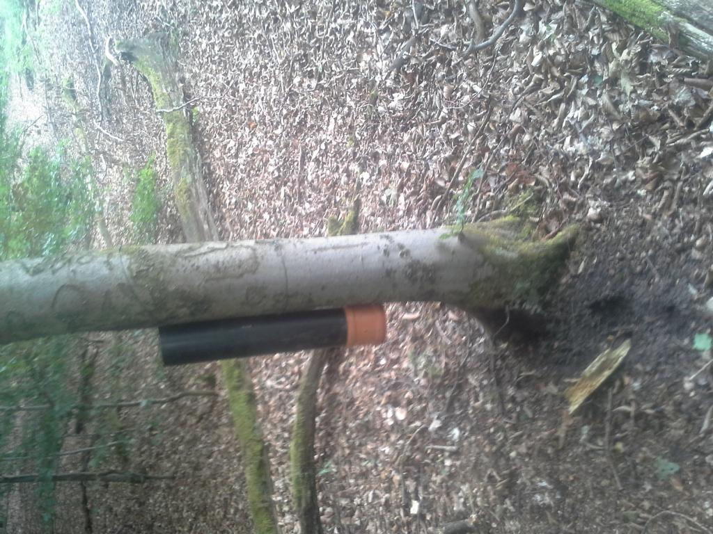 Dabei handelt es sich um ein KG Rohr mit seitlichen Löchern in das etwa 15cm eine weiße Substanz eingefüllt war und aus dessen Löchern etwas Wasser tropfte (hatte kurz zuvor geregnet). In dem Wasser war die Substanz gelöst.