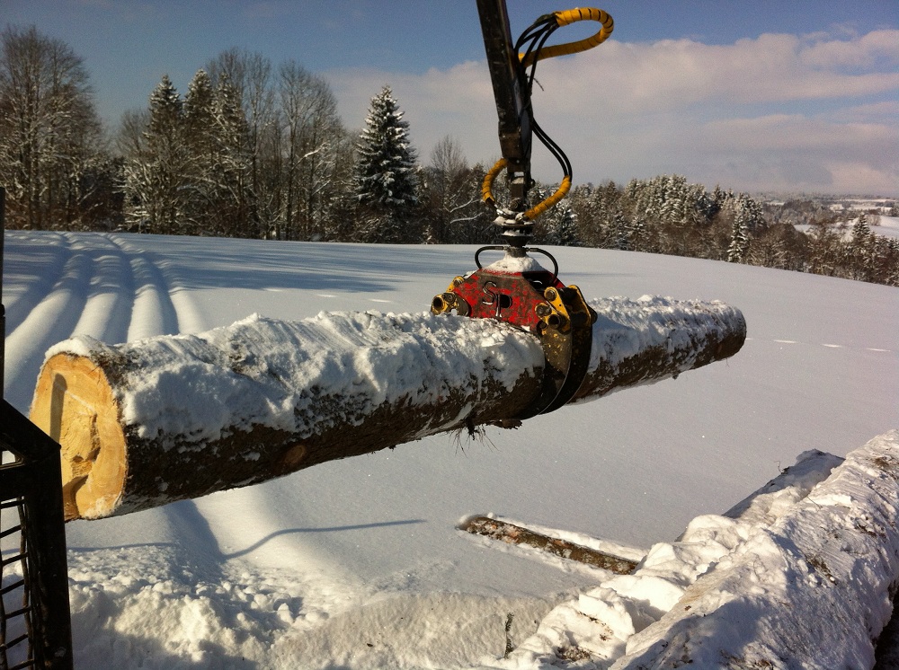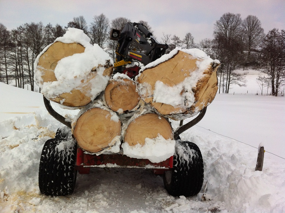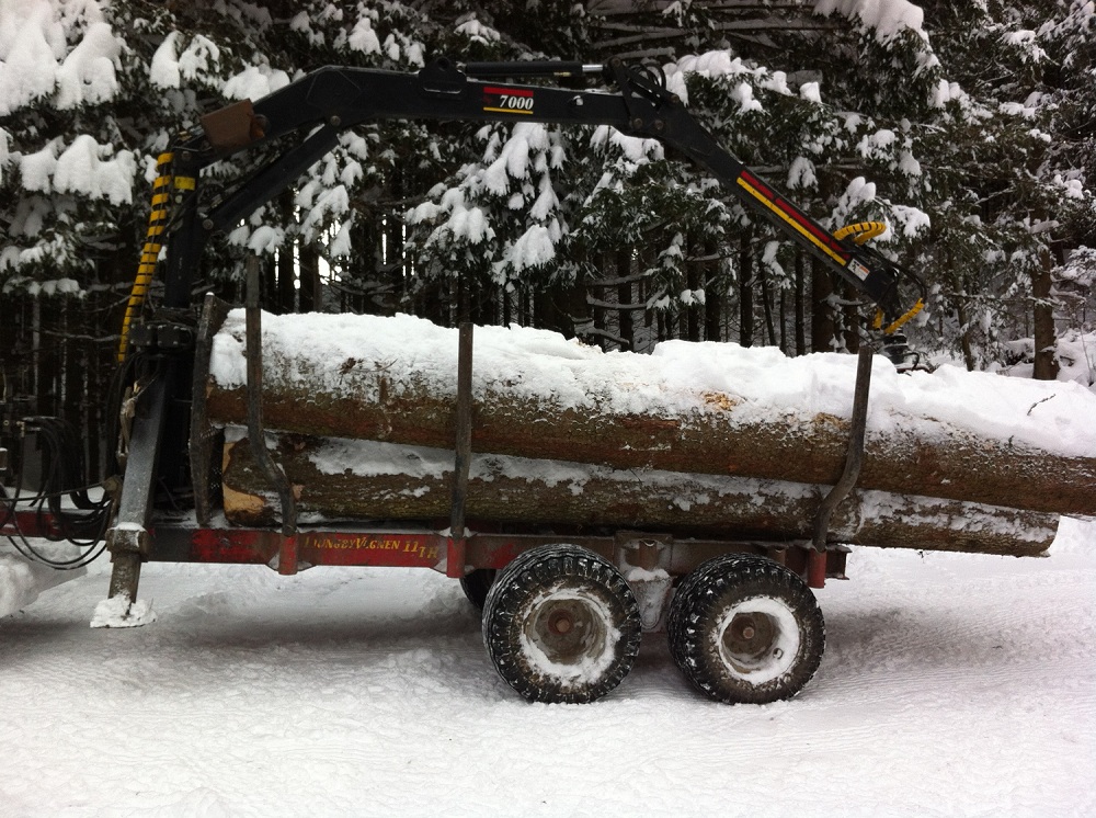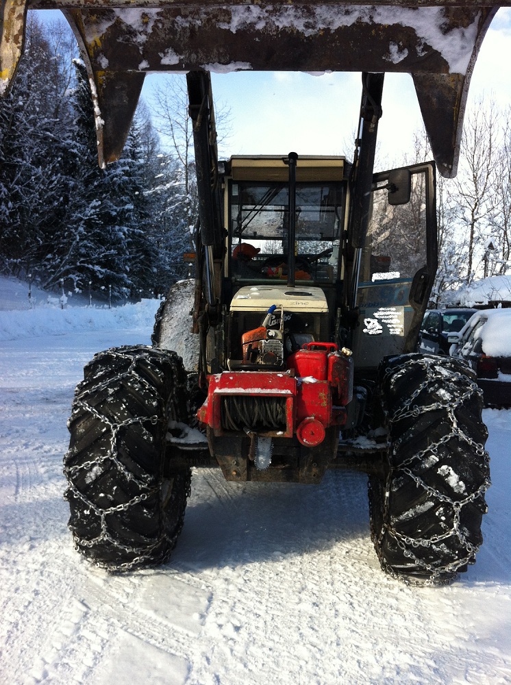 ich bin heute mit dem kleinen Gespann ausgerückt, weil der Plan ursprünglich war nur einige Meterrollen zu sägen und im Wald zur späteren Abholung liegen zu lassen. Hab mich dann aber für die direkte Mitnahme entschieden, da die Wiese doch gut gefroren war und man recht gut fahren konnte. Außerdem durfte dann gleich mal das neue Rückegestell getestet werden.