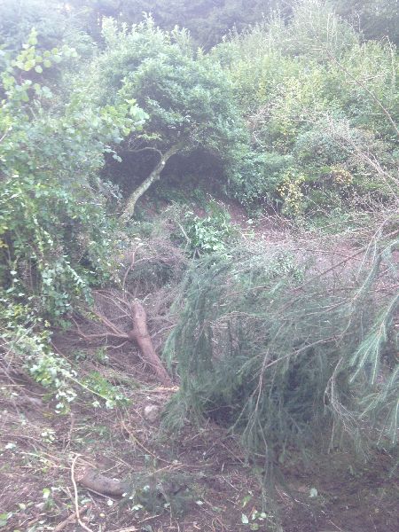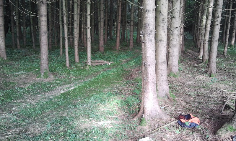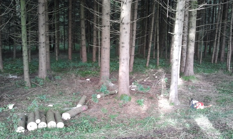 Abgebrochene Windbruchfichten entfernen und den Wanderweg im Wald freiräumen.