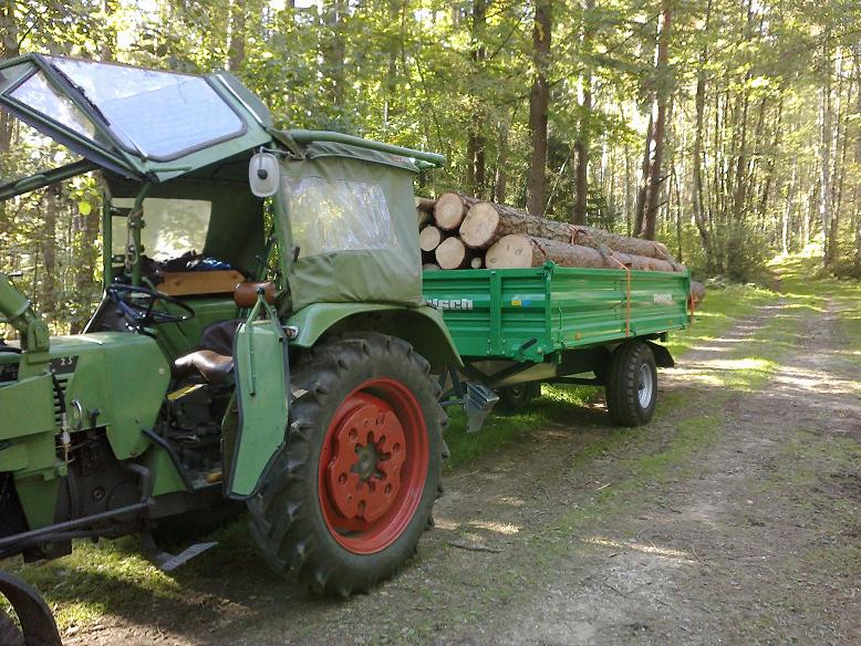Deutz DX 85 mit Forstkran KTS 6,30. Rückewagen Eigenbau 4 T. Hydraulische Winde Eigenbau für den Frontanbau . Fendt GT für Hackschnitzelbunkerbefüllung und Schneeräumen. 2 Hänger Stihl 044 Stihl 035C