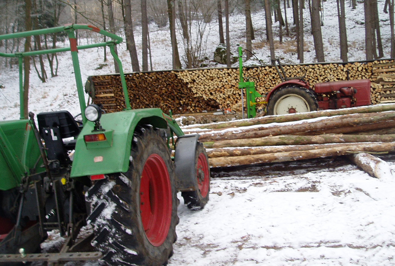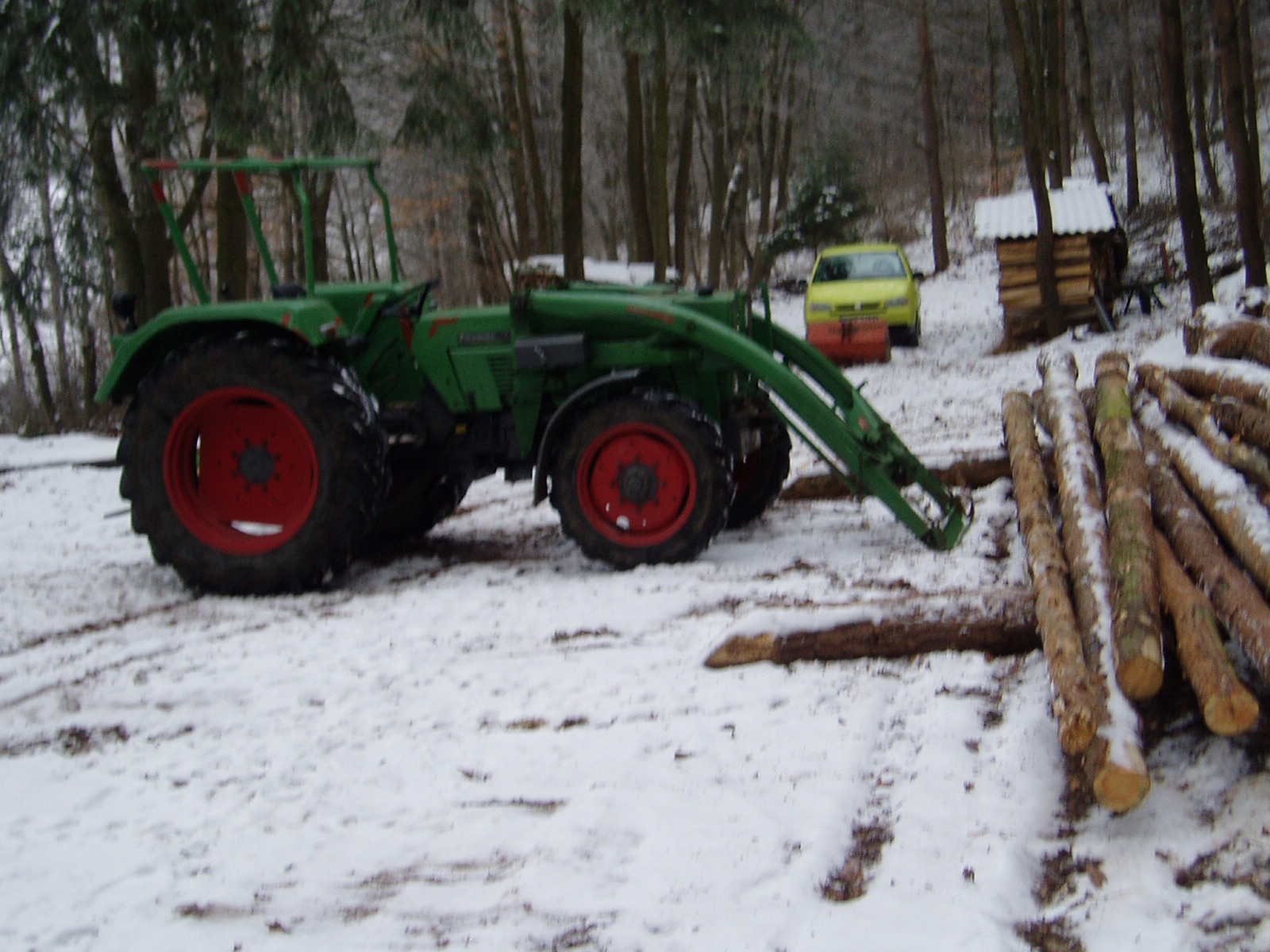 Könnt beinah neidisch werden: war heut auch im Wald; nur Hinterradantrieb und Frontlader, der sich in der Neigung nicht verstellen läßt Sobald ein Vorderrad in ein 10cm-Loch fährt, gehts auf dem gefrorenem Boden nicht mehr rückwärts, höchstens mit Differentialsperre vorwärts - wenn da kein Baum steht