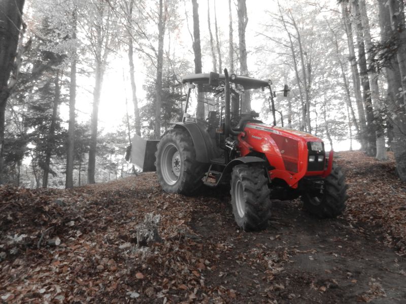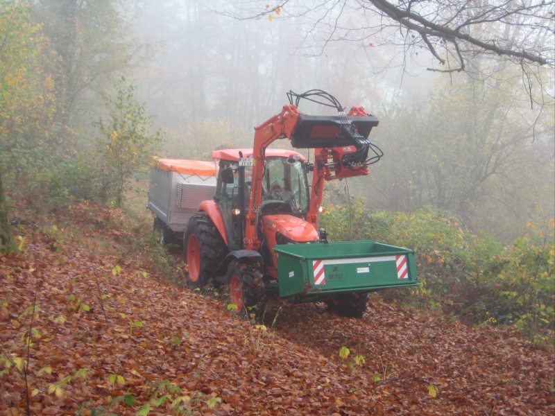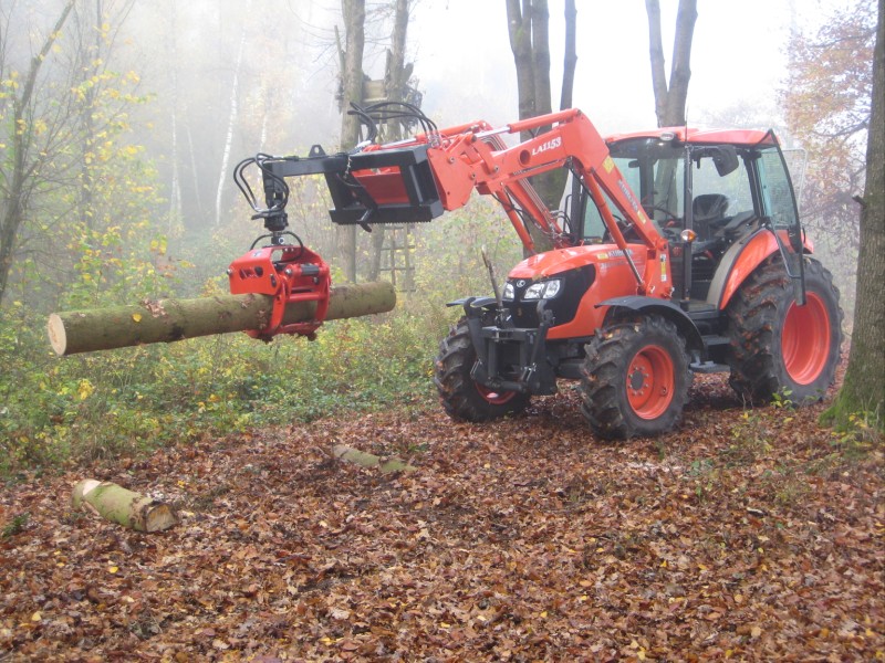 Laden des Stammabschnitts mit dem Frontlader. Da macht sich die Wasserfüllung in den Hinterrädern ganz gut.
