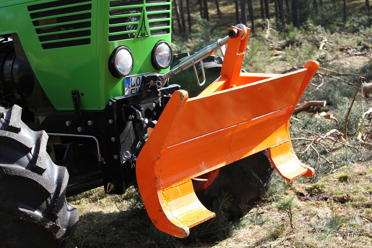 Bei mir dient es zum einen, beim Rücken von Kurzholz, dass ich vor dem Schlepper die Fahrspur einigermaßen räumen kann ( Kran vom RW schwenkt nur 270°) und dann auch noch als Frontgewicht. Aber es ist auch zum Poltern möglich.