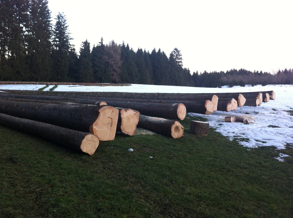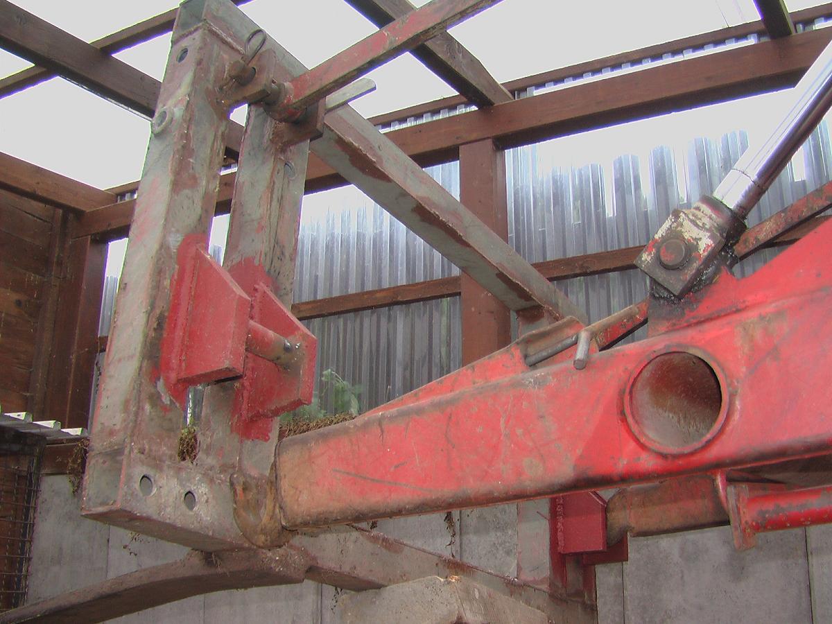die Zinken sind aus 25mm Baustahl die aber eine Kaltverformung (Polter mit Kraft geschoben; siehe Bild) nicht verhindern konnten. Das Traggerüst wurde aus starkem Winkeleisen (ehemaliger Hochspannungsmast) zusammengeschweisst.. Gesamtgewicht ca. 120 kg.