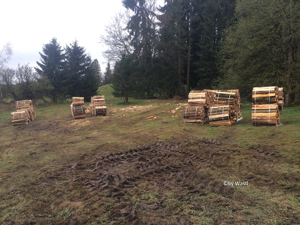 Servus, noch ein Bild von letzter Woche. Das Holz für die eine Kundschaft fertig gespalten, sind nochmal 37 Ster geworden. Die werden Augen machen wenn dann 72 Ster Bündel im Garten liegen. Fahren kann ich aber erst wenn es trocken ist. War beim Spalten am Schluss schon ziemlich nass.