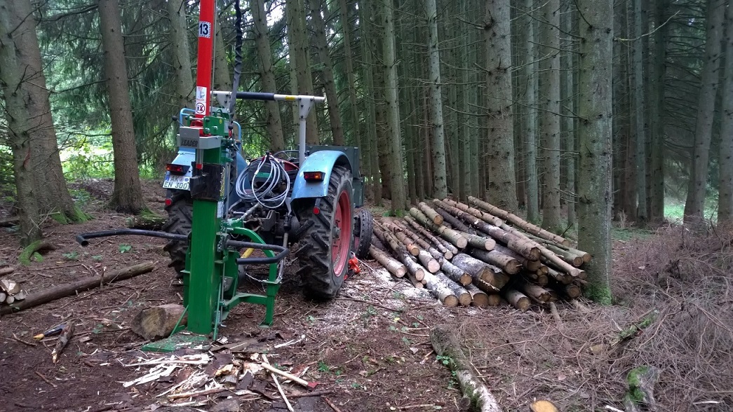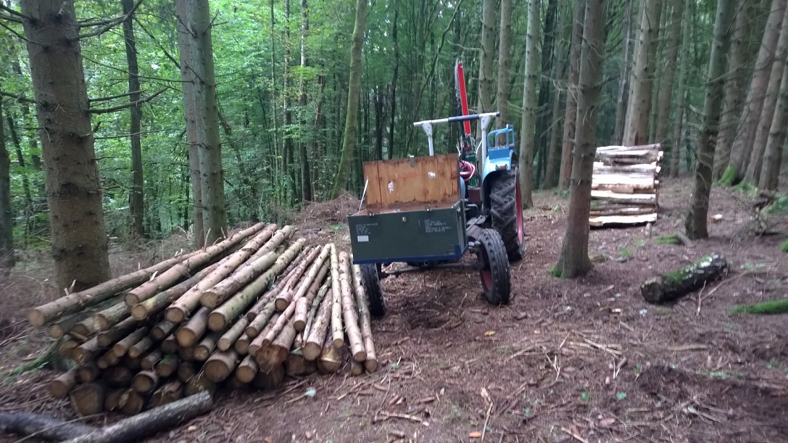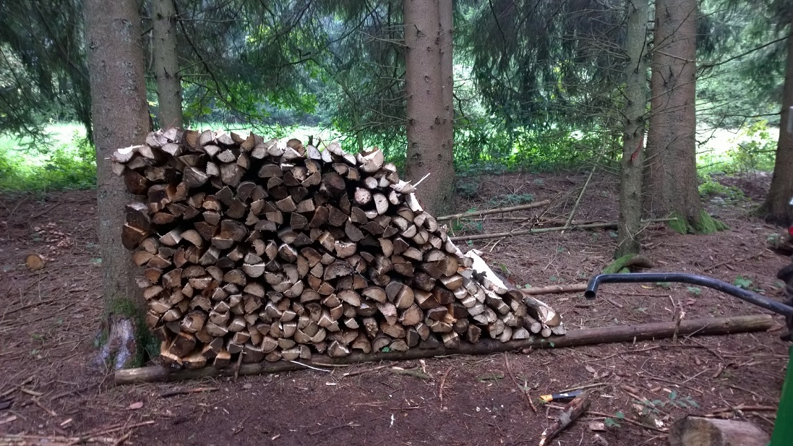 Vorteil von den Bündeln für mich ist der, dass ich beim Verkauf von 1m Scheiten genau weiß, wie viele RM ich dabei habe und die Bündel nach hinten herunterrollen kann, wenn die Ladefläche des Anhängers leicht angekippt ist (Anhänger ist kein Kipper sondern kann nur zum Auffahren mit Maschinen Pkws etc leicht angekippt werden).