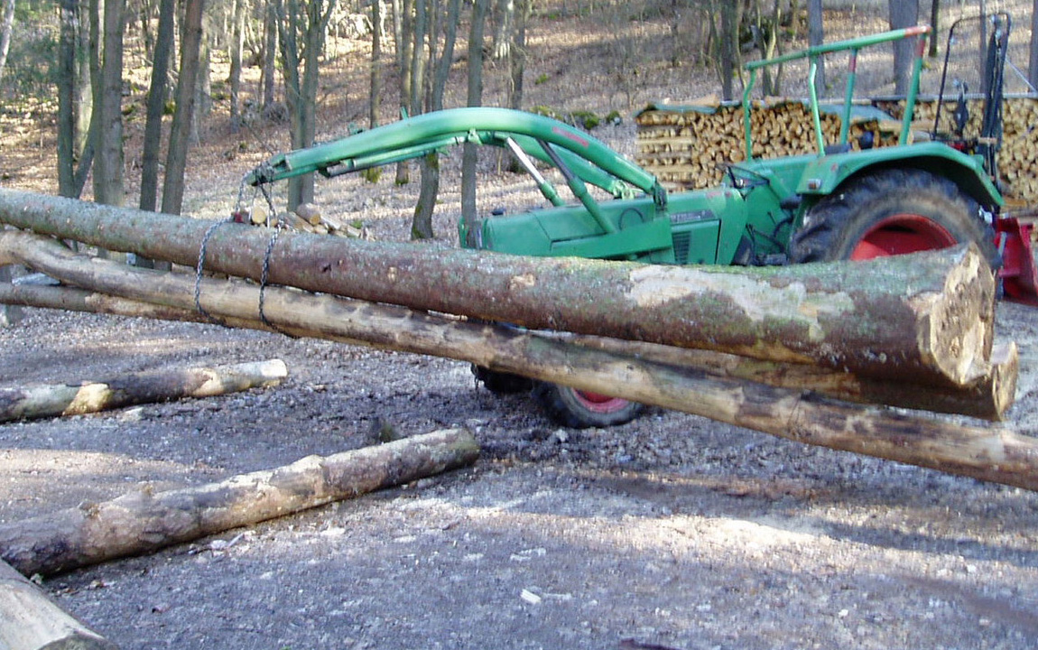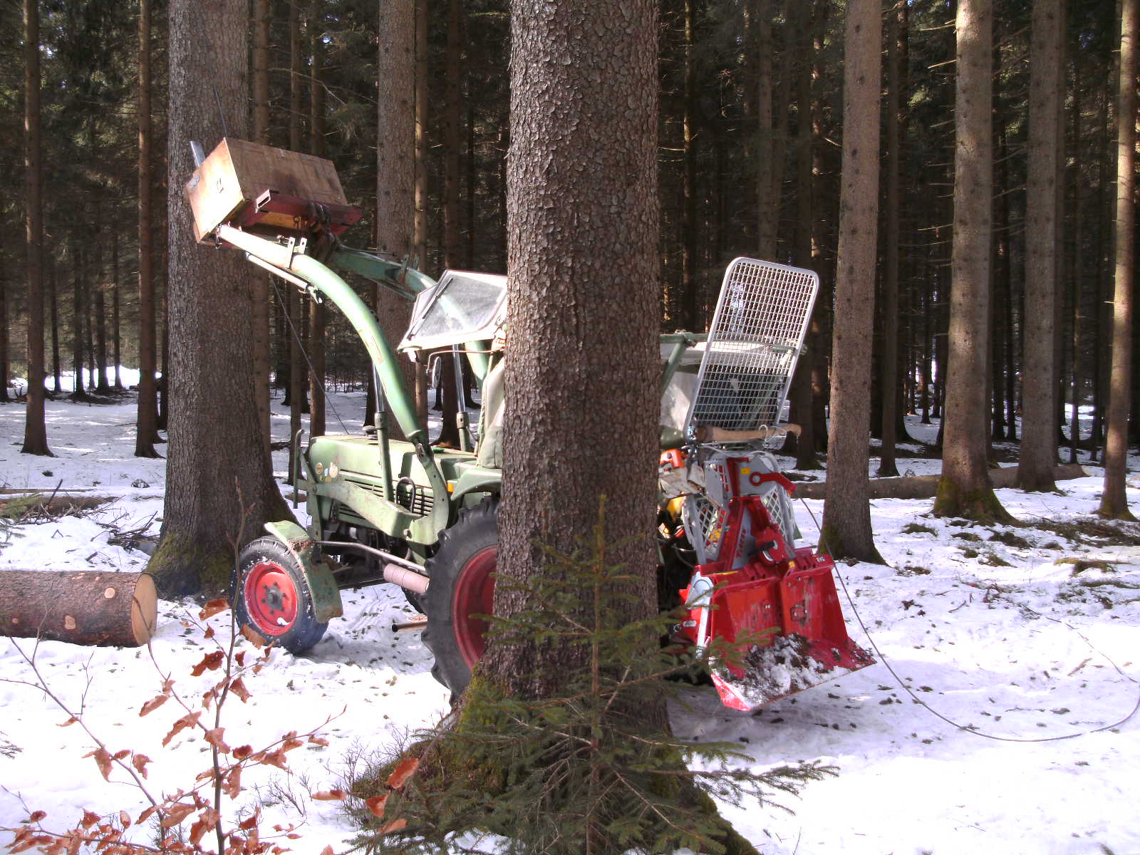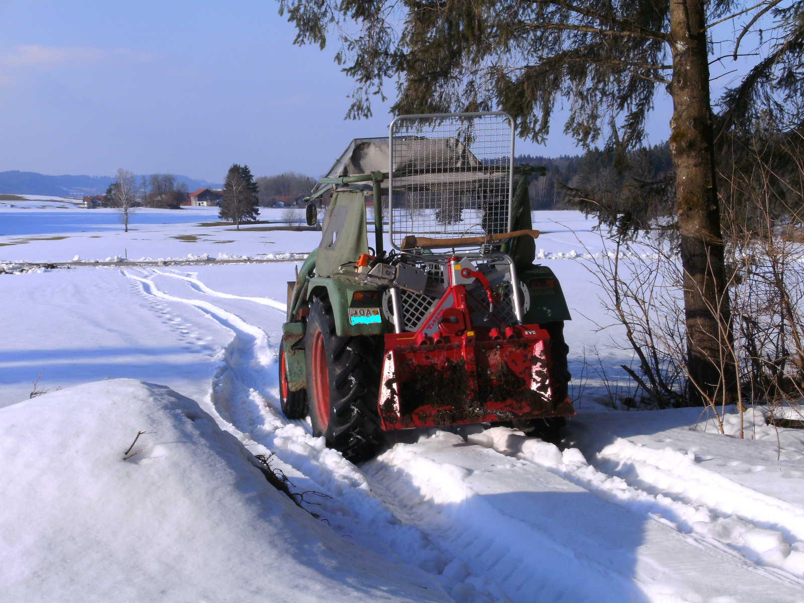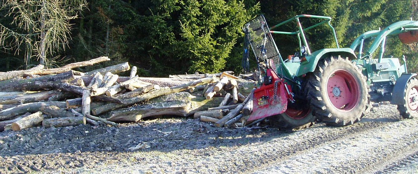 Meine Tajfun hatte heut (gestern) ihren ersten Arbeitseinsatz im Wald. Bin recht zufrieden mit ihr. Vorher hab ich 2 Umbauten gemacht: Den Sägenhalter schräger gestellt, sonst hätts nen Crash zwischen Motorsäge und Rücklicht gegeben; und das Schutzgitter hab ich mittels Langlöchern verstellt, sonst hätt sichs am Sturzbügel verbogen.