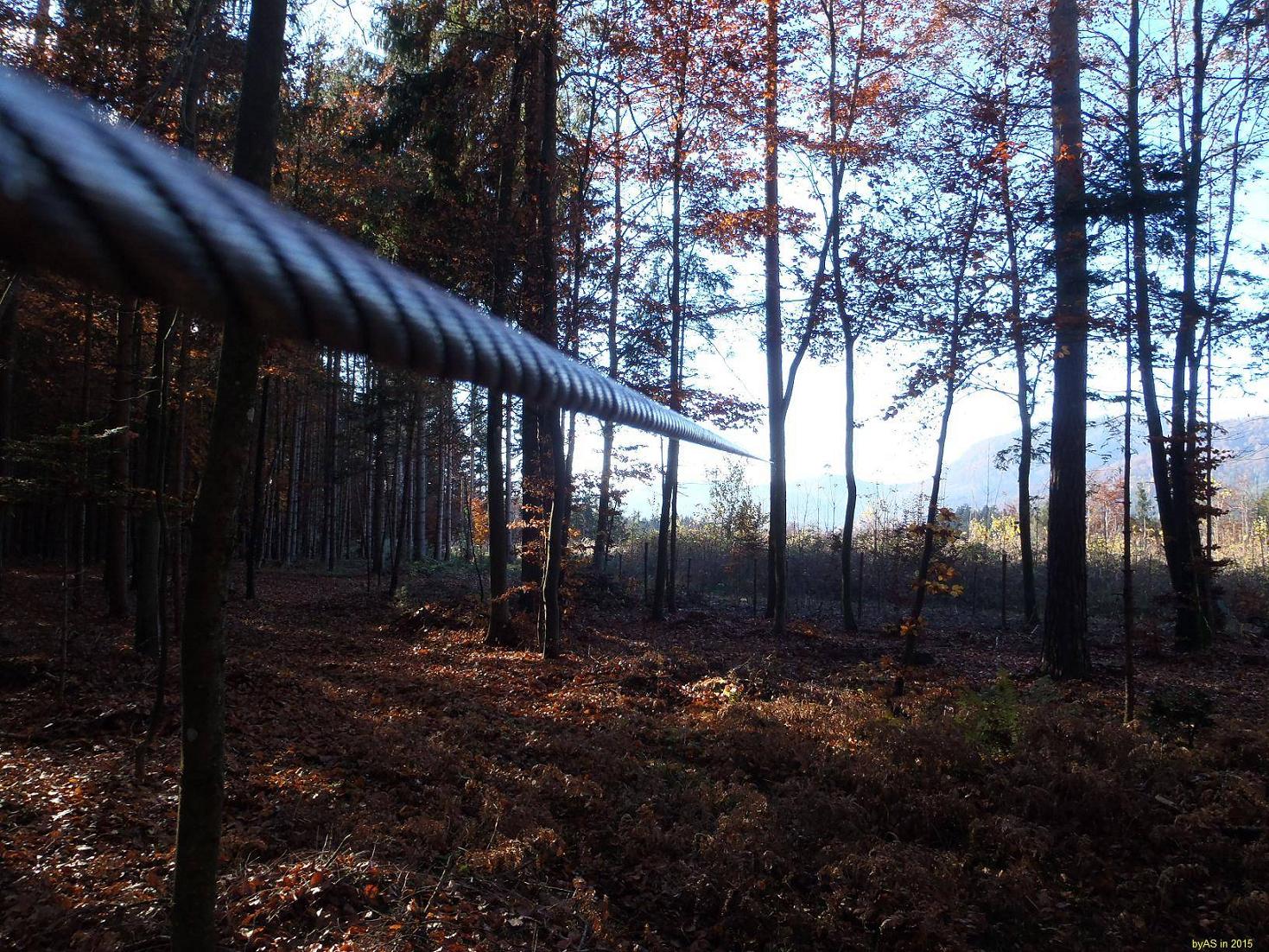 Interessante Perspektive bei einer seilwindengestützten Fällung. Die Kiefer durfte auf keinen Fall in Nachbar's Pflanzung fallen ...
