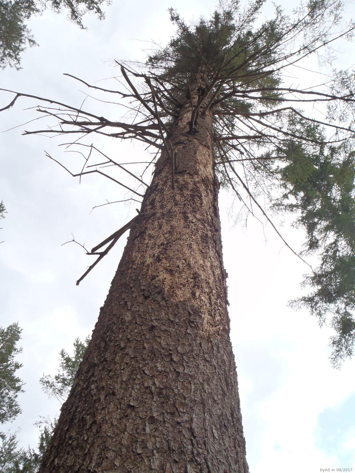 Die meisten Fichten haben trotz auf vollem Umfang schon großflächig abgeplatzter Rinde noch eine grüne Krone