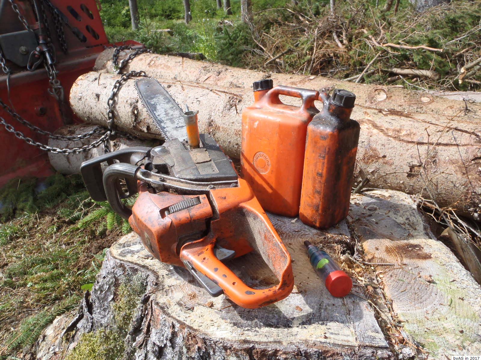 Zwischendurch die Säge verhätscheln. Tanken, Kette nachspannen, Schwertspitze fetten ...