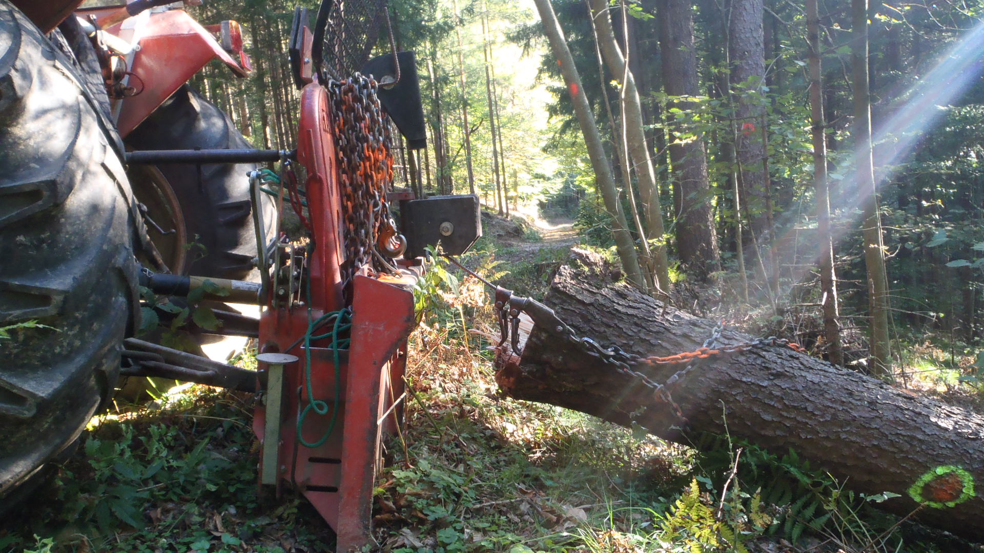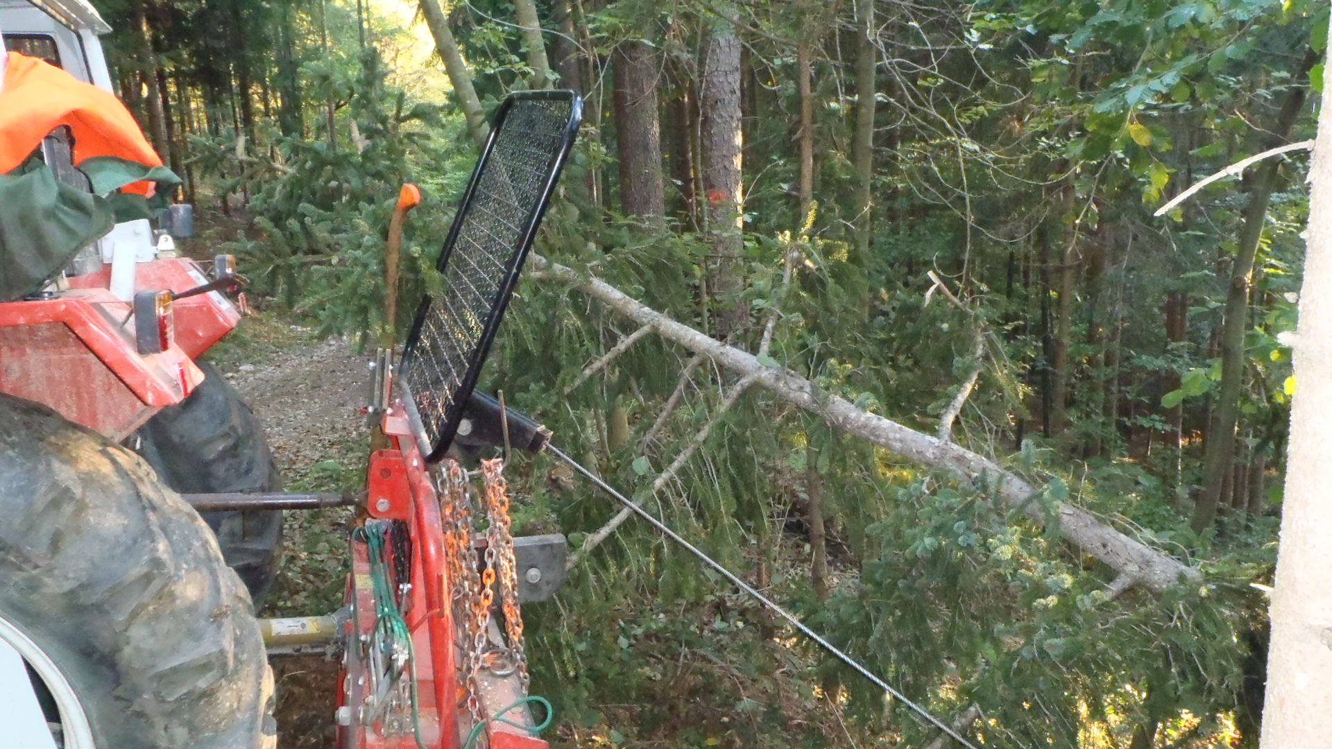 Die untere Seileinlaufrolle verwende ich fast nur in solchen Situationen, wo ich ganze Stämme aus dem Graben ziehe und kein passender Wurzelstock als Widerlager da ist