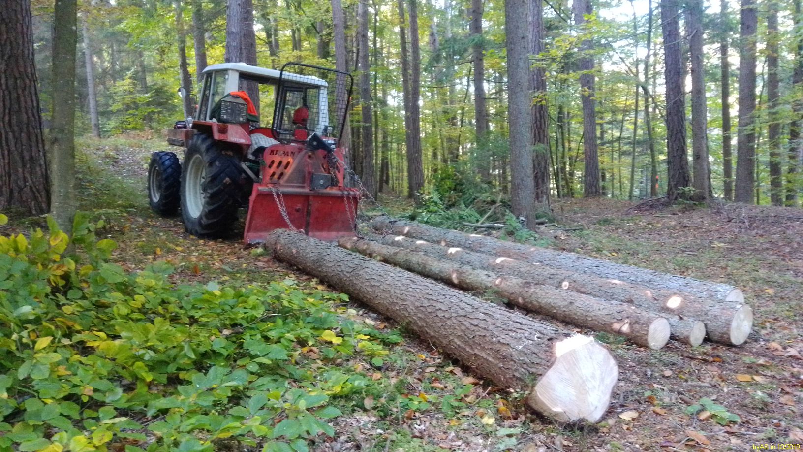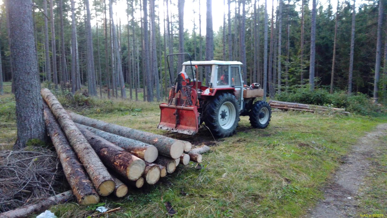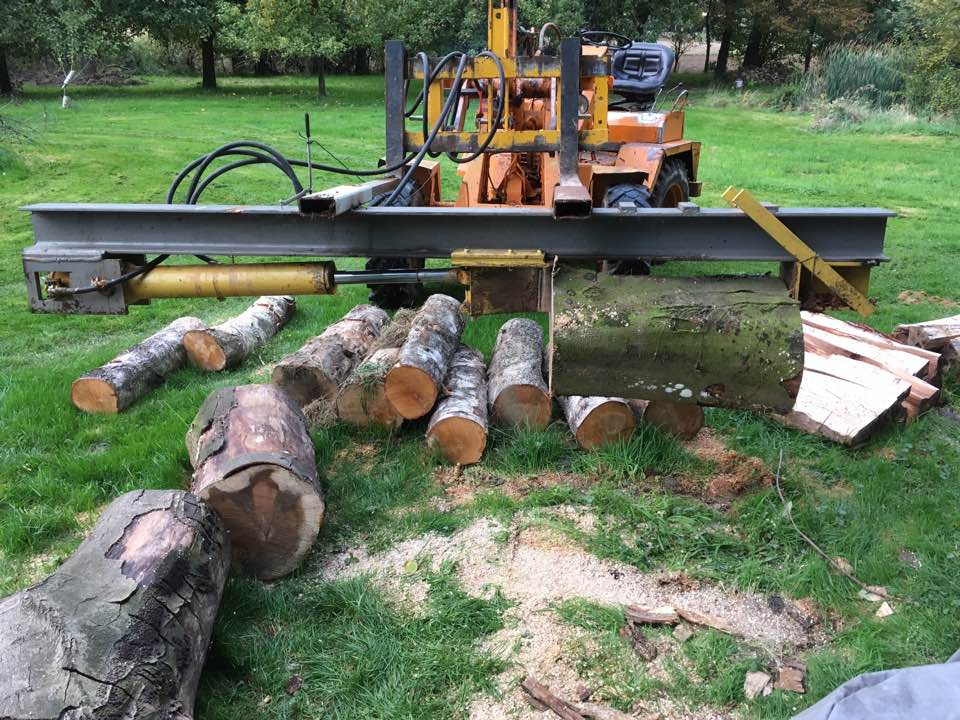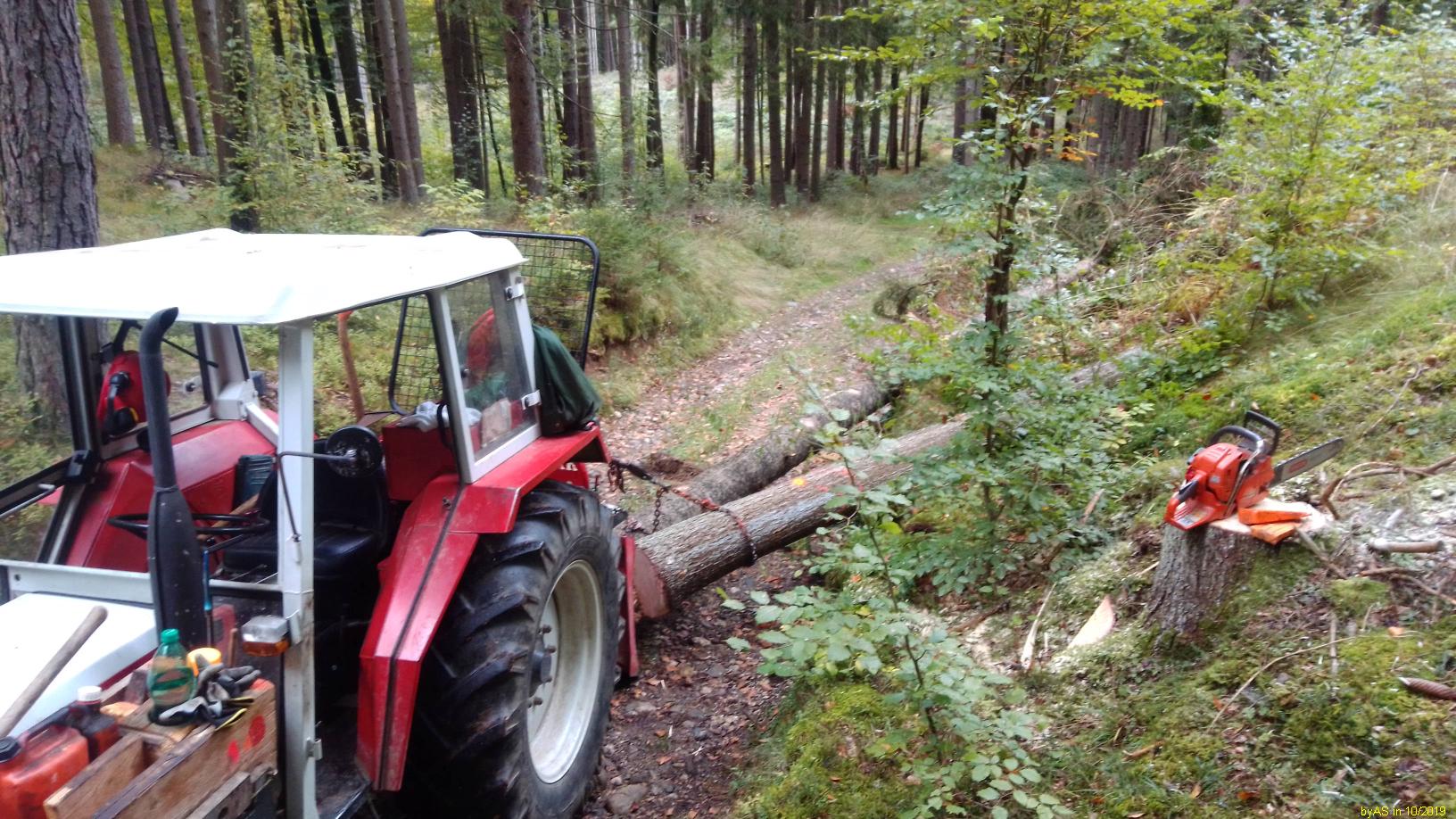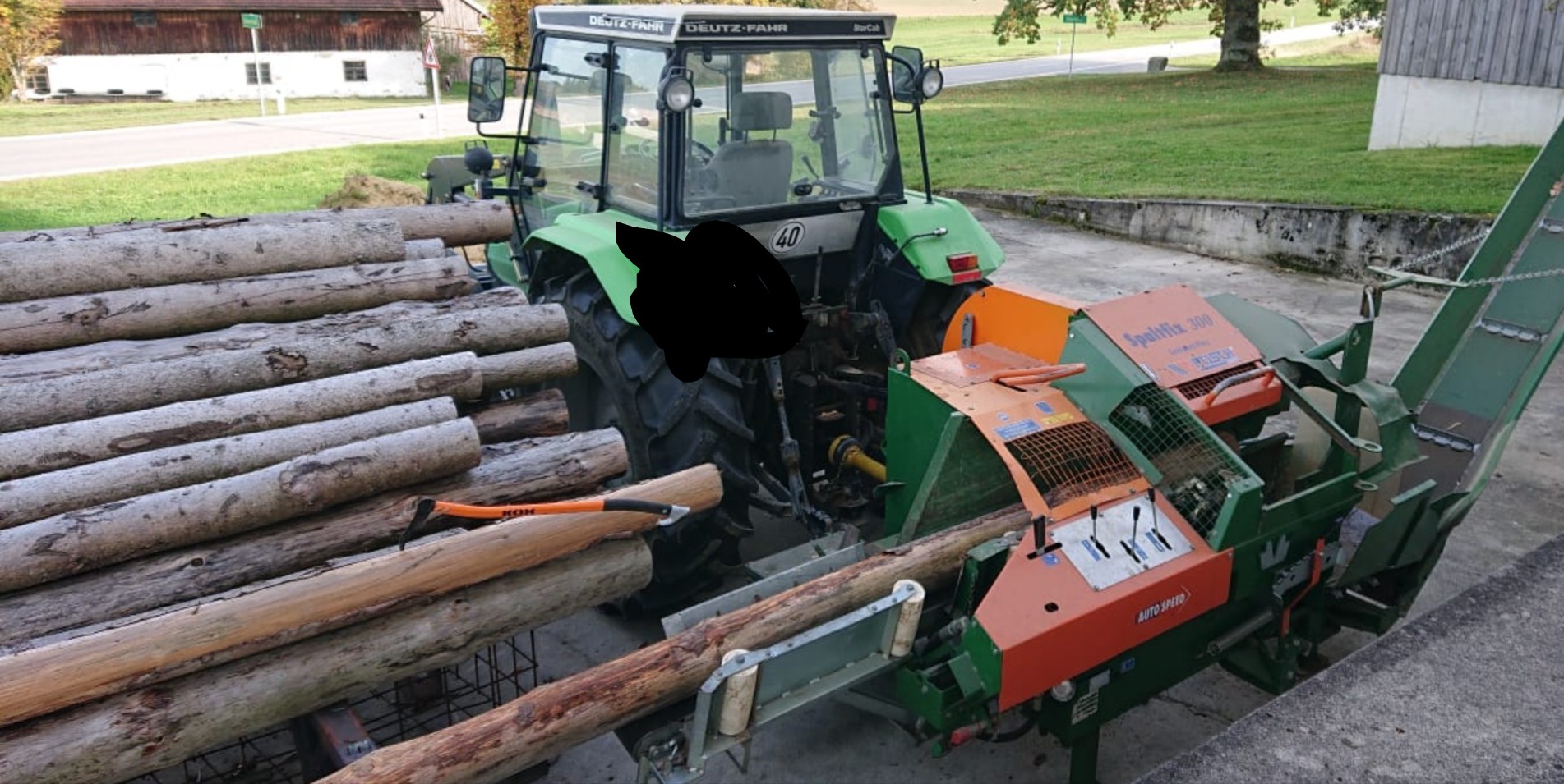 Normalerweise schneide ich das Holz immer auf Spaltlänge, und dann kommt es zum trocknen in Gitterboxen. Weil ich die letzten Jahre zuviel Holz (Windbruch) habe spalte ich es jetzt auch in Meterlängen zum trocknen. Die schweren Rundhölzer gehen aber auf den Rücken. Habe jetzt einen Holzspalter für die Palettengabel im Radlader umgebaut. Damit sollen die Rundlinge grob vorgespalten werden. Gestern die ersten Hölzer gespalten. Klappt gut. Der Anschluß erfolgt an einem freien Steuerkreis vom Radlader. Durch die Knicklenkung ist der Lader sehr beweglich. Der Stempel drückt ca. 18t. Ich habe noch einige Buchenstücke mit einem Durchmesser über einen Meter, da wird es dann interessant.