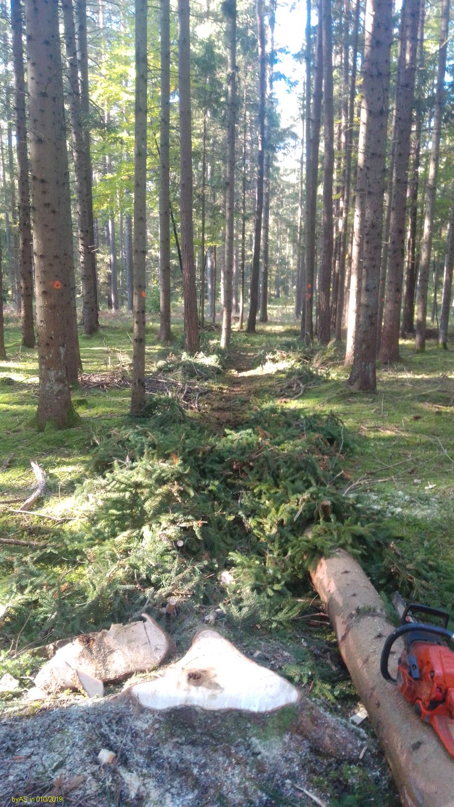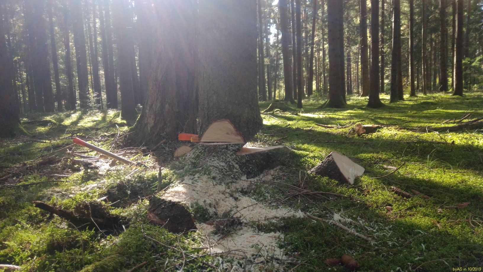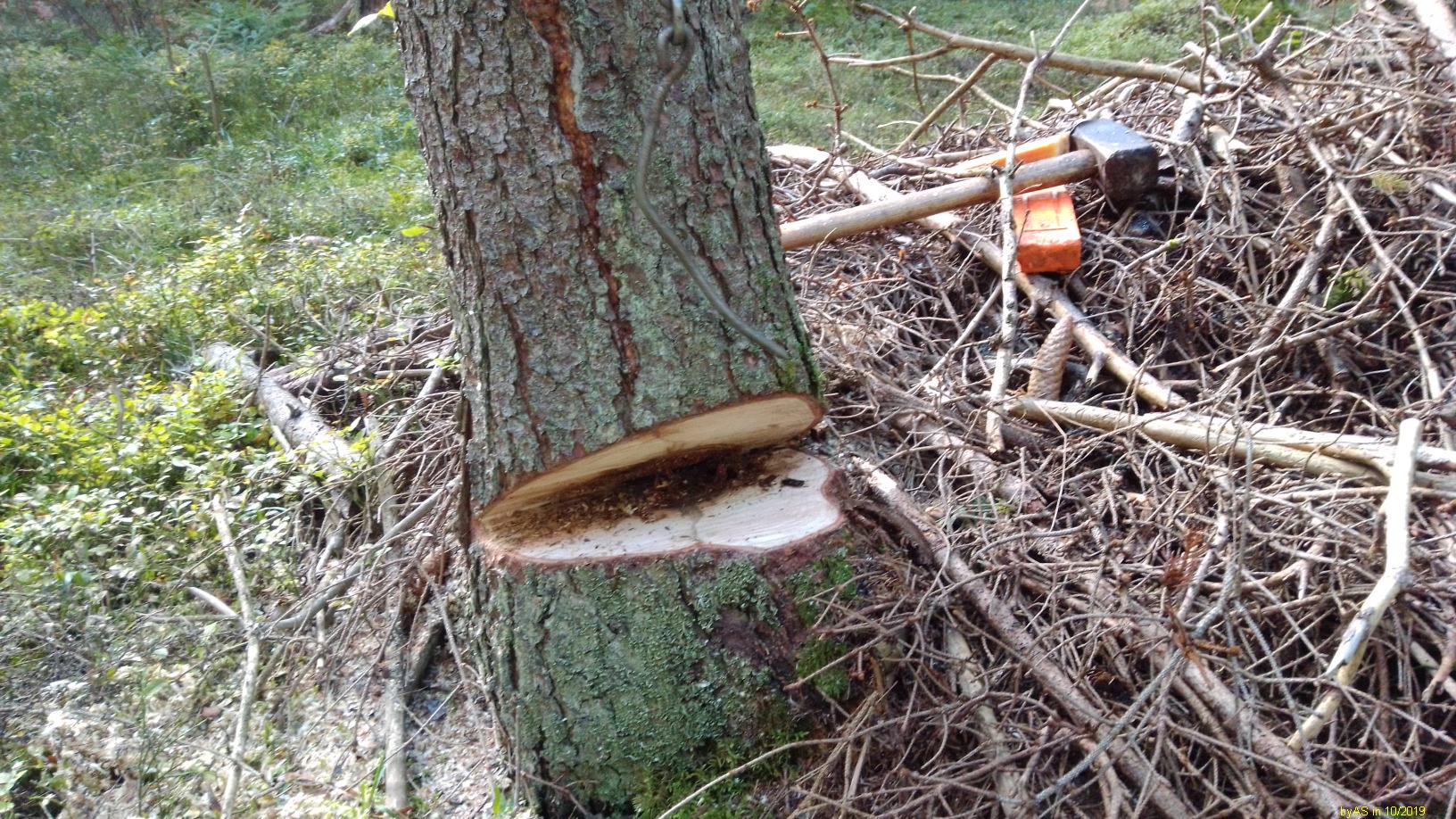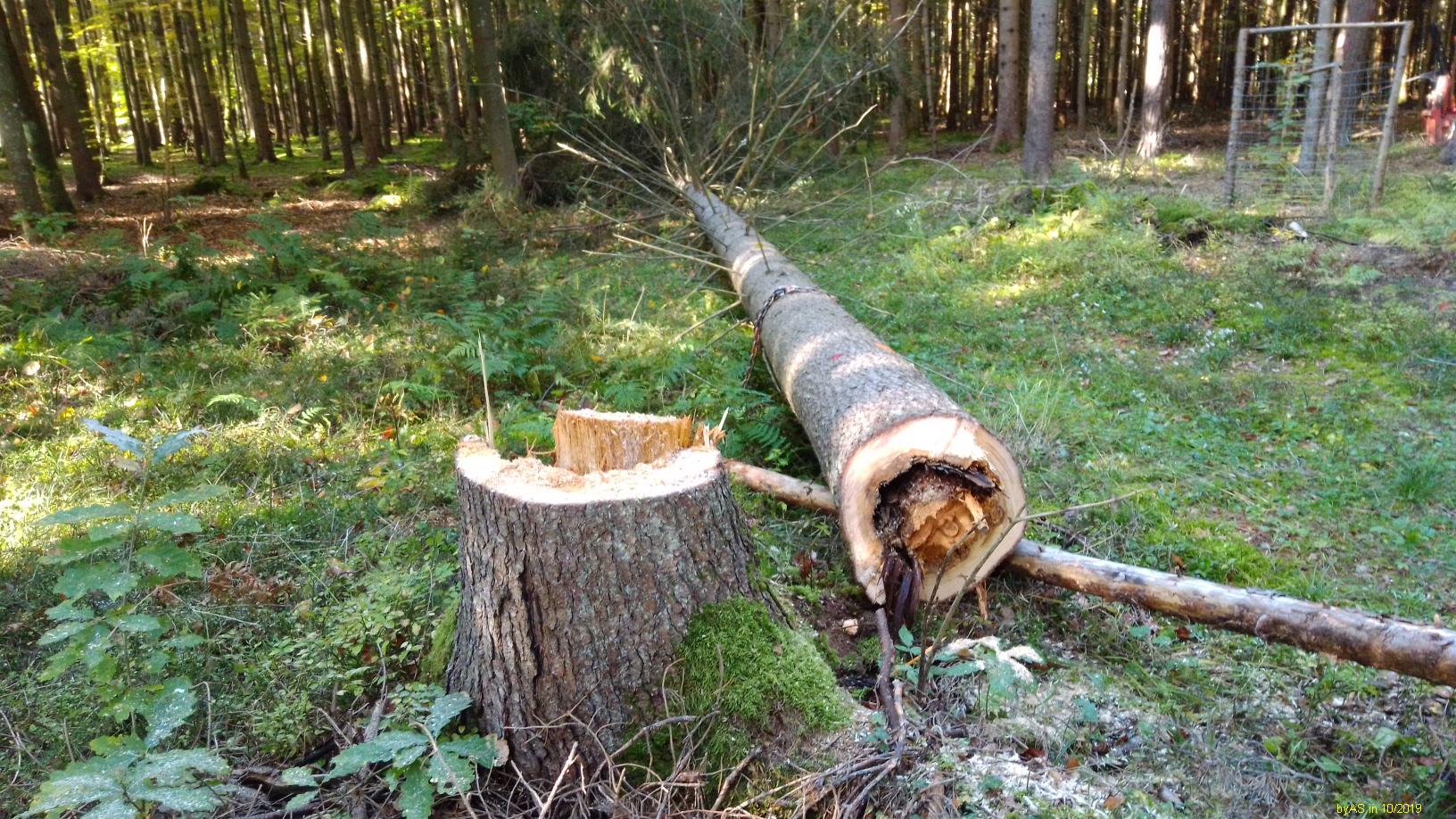 Normalerweise schneide ich das Holz immer auf Spaltlänge, und dann kommt es zum trocknen in Gitterboxen. Weil ich die letzten Jahre zuviel Holz (Windbruch) habe spalte ich es jetzt auch in Meterlängen zum trocknen. Die schweren Rundhölzer gehen aber auf den Rücken. Habe jetzt einen Holzspalter für die Palettengabel im Radlader umgebaut. Damit sollen die Rundlinge grob vorgespalten werden. Gestern die ersten Hölzer gespalten. Klappt gut. Der Anschluß erfolgt an einem freien Steuerkreis vom Radlader. Durch die Knicklenkung ist der Lader sehr beweglich. Der Stempel drückt ca. 18t. Ich habe noch einige Buchenstücke mit einem Durchmesser über einen Meter, da wird es dann interessant.