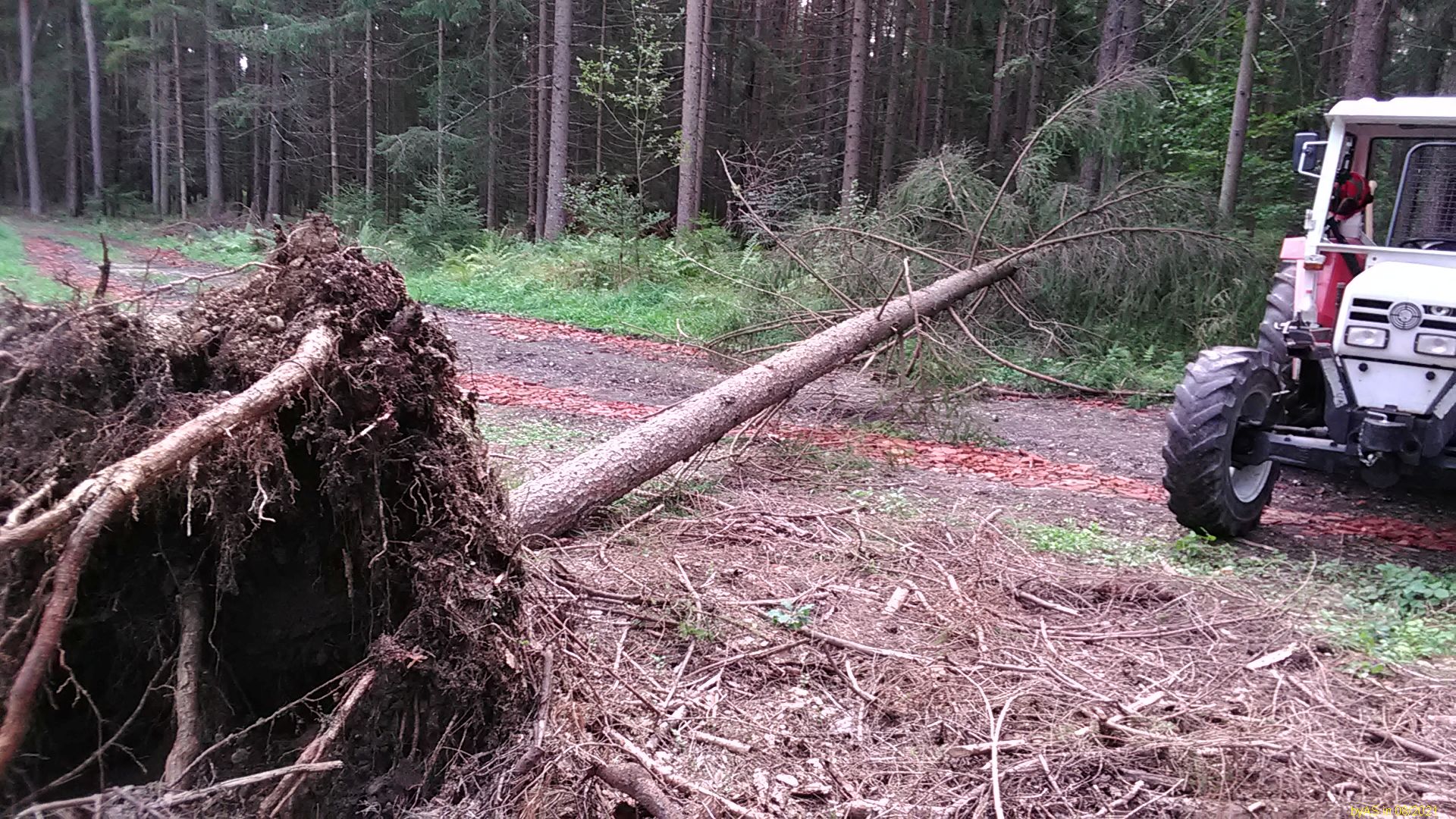 (der Baum lag schon seit Samstag. Aber der Pfarrer als Eigentümervertreter kann die Räumung schlecht für den Sonntag anordnen ...![]()