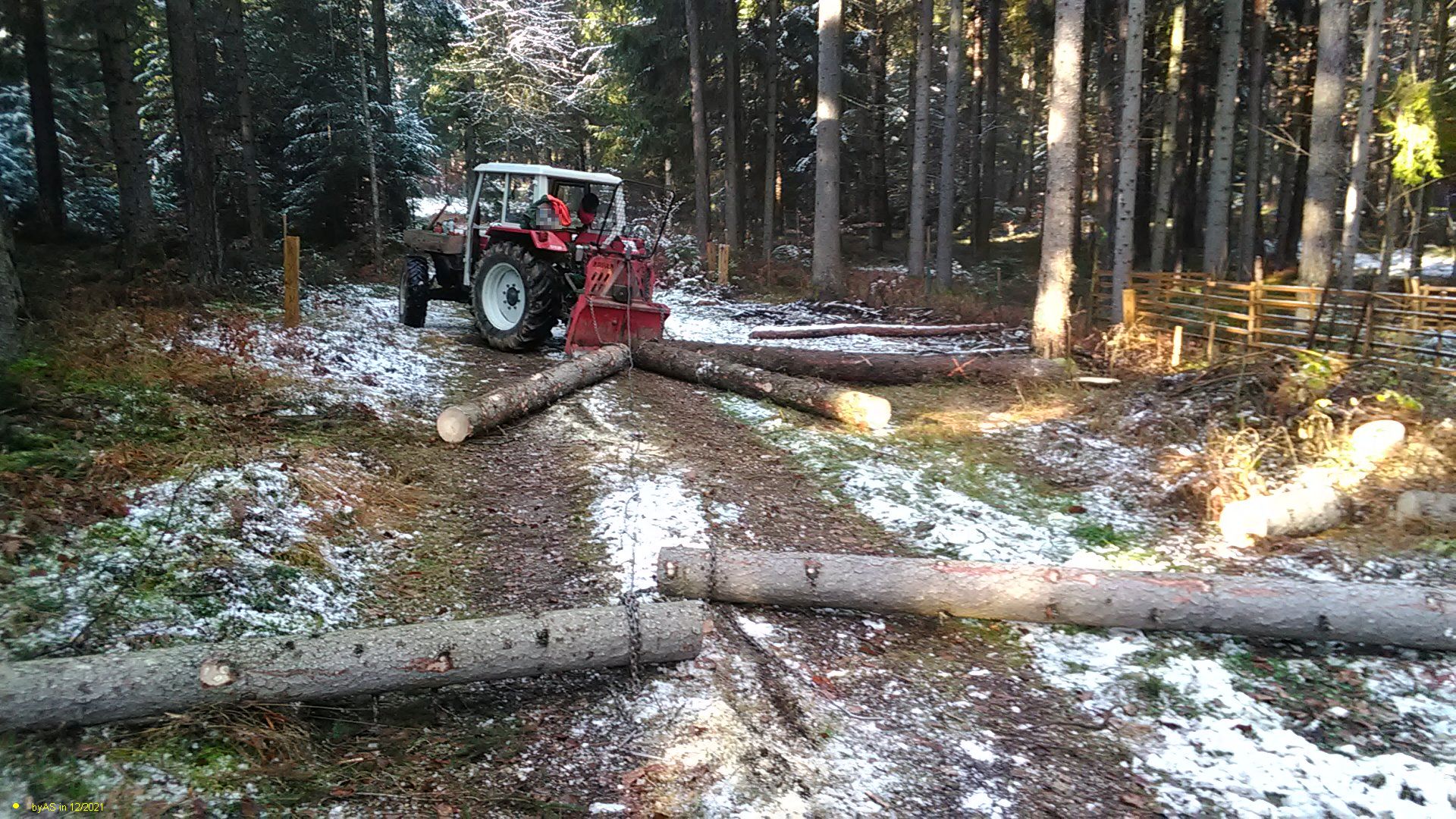 kann mir wer hier noch einen Tipp geben wie ich den mittleren und rechten Stamm denn auf den Rückewagen geladen bekomme?