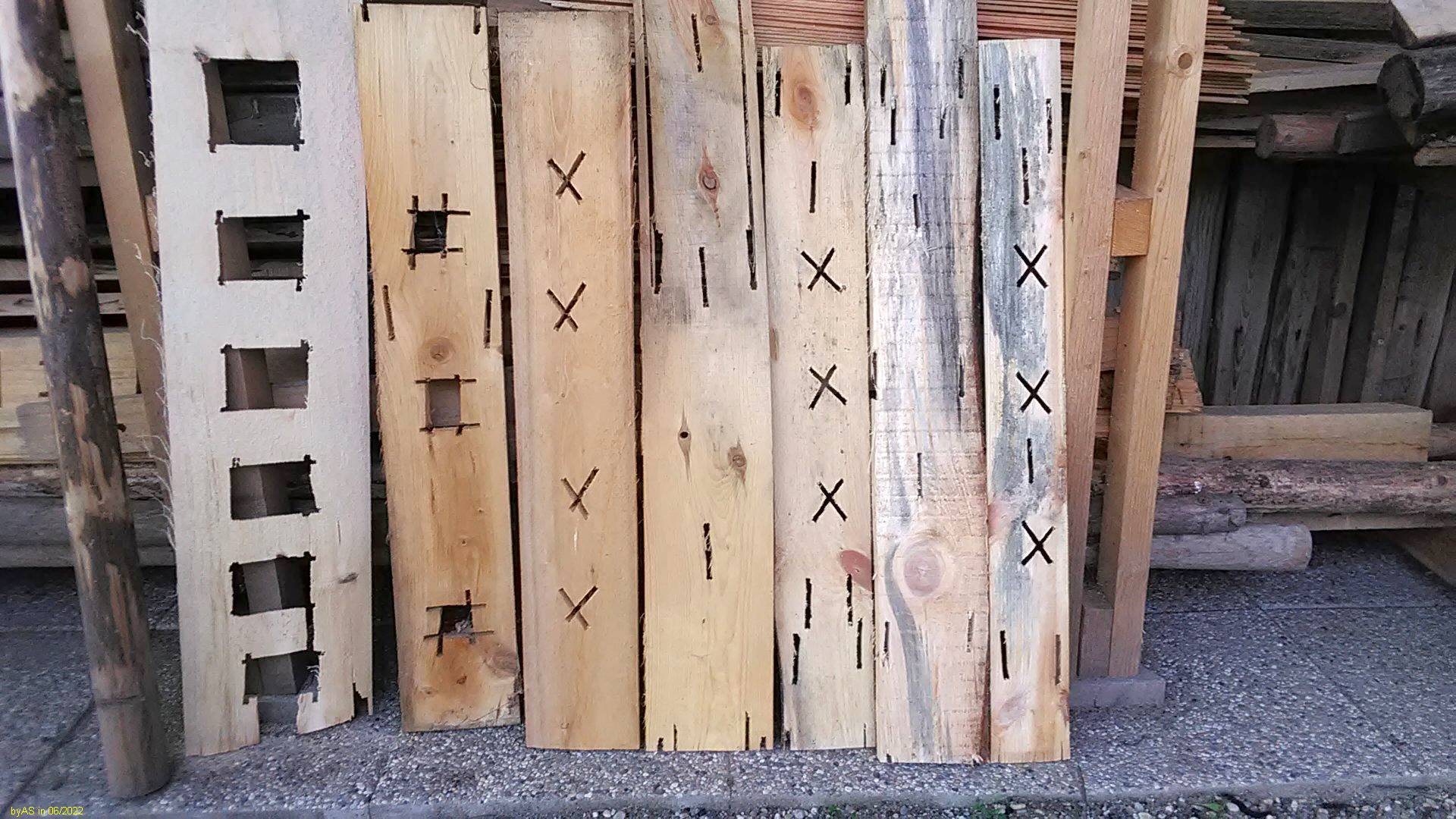 Also, Schwarten ab, dann in den quadratischen Block mit der Motorsäge seitlich einstechen und die Öffnungen schneiden, dann den Block um 90° drehen.