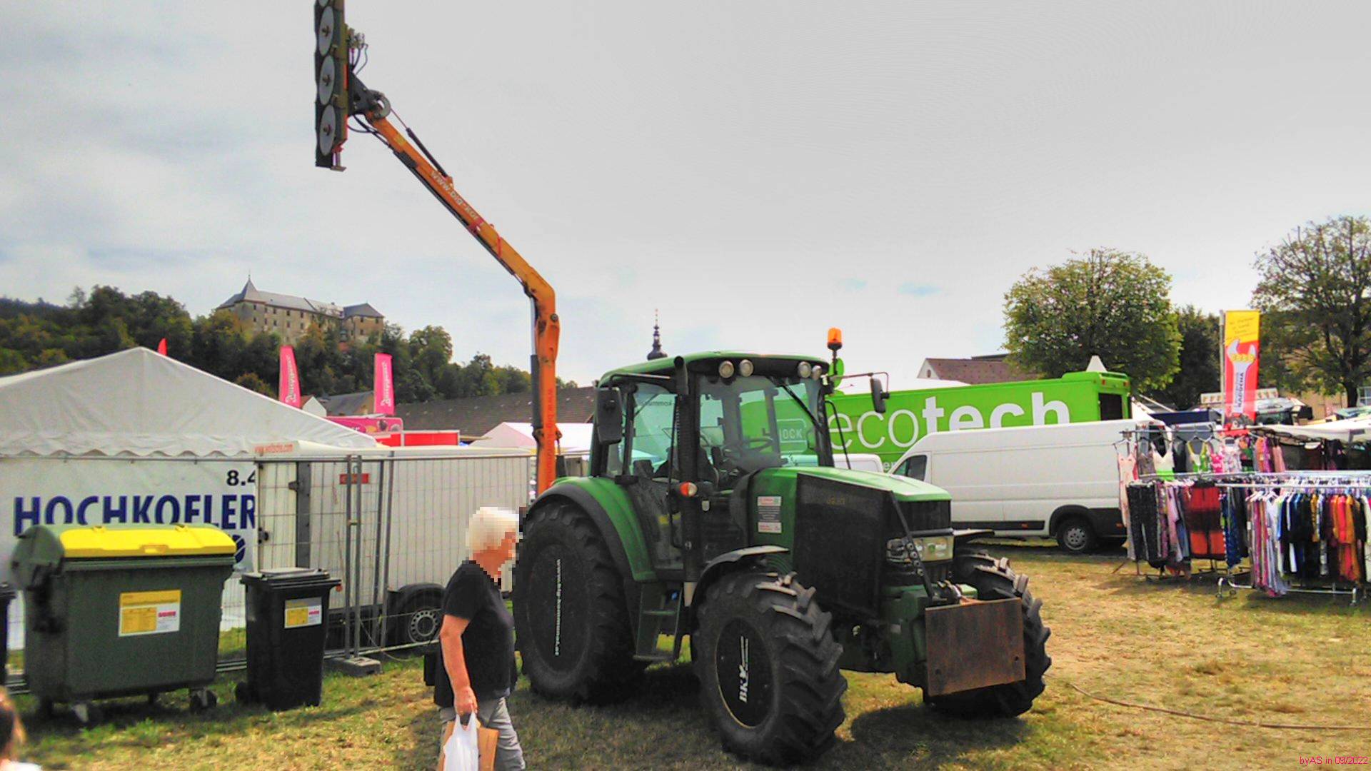 Auf dem Bildern von 2019 ist zu erkennen wie der Mähbalken im Eingeklappte Zustand ist . Der Mähbalken kann Hydraulisch um etwa 210 Grad , bis Senkrecht nach unten geschwenkt werden .So können die abgeschnittenen Äste einfach auf den Boden fallen und bleiben nicht auf dem Gerät liegen. Außerdem kann er Hydraulisch um 1 m zur Seite ausgefahren werden.