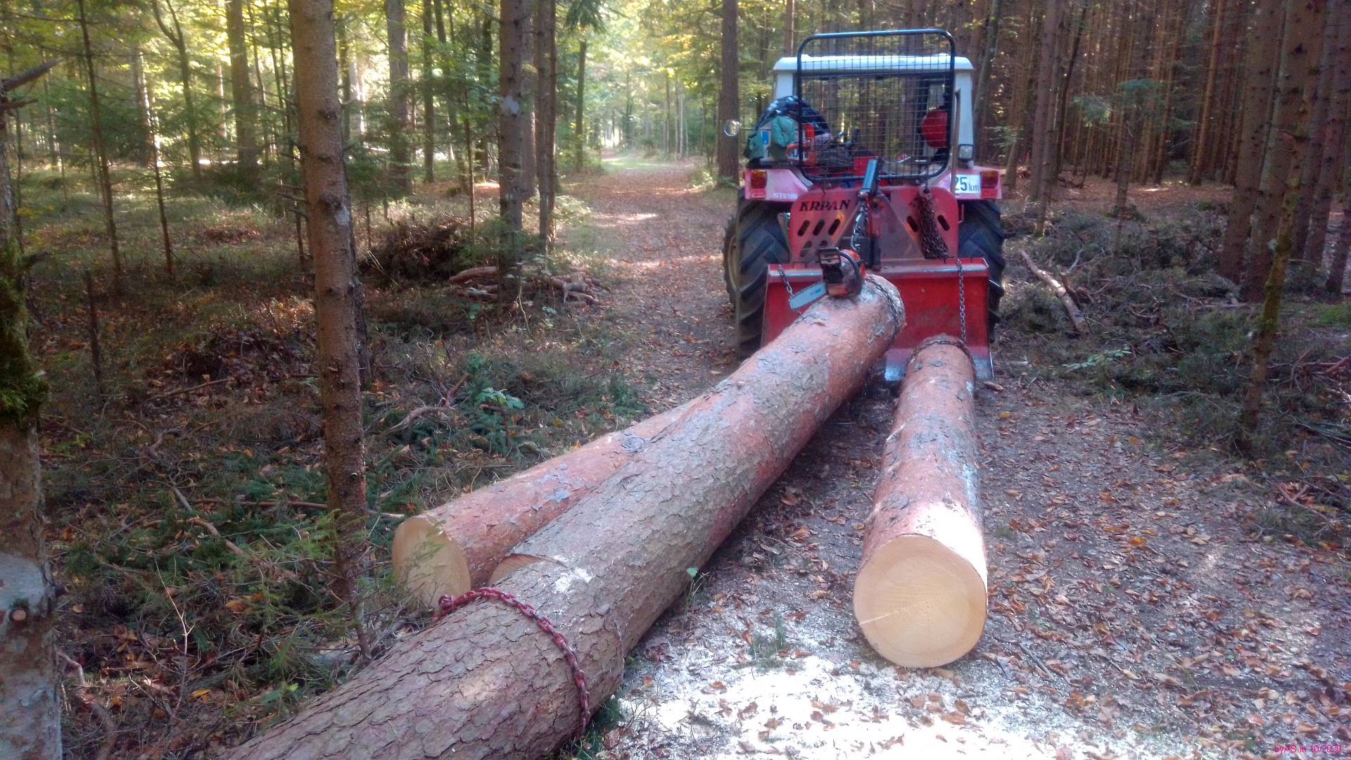 Ich hab' endlich Zeit gefunden, die hier gefällten Kiefern zu rücken, damit ich sie zu meiner Bandsäge transportieren kann.