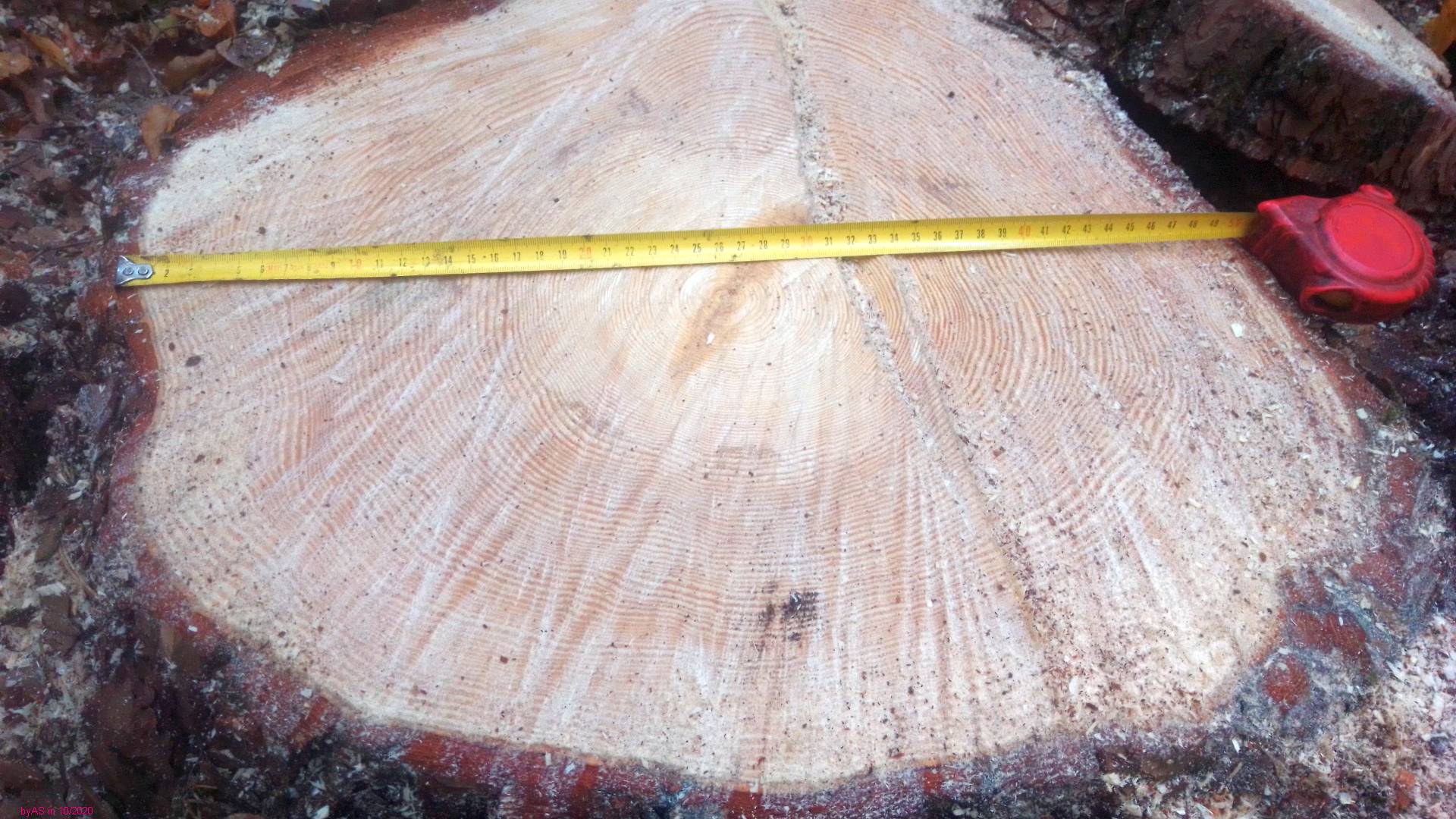 Die Kollateralschaden-Kiefer wurde in 140 Jahren nur 50 cm dick (Fußdurchmesser), und hat offensichtlich sehr unterschiedliche Wuchsbedingungen erlebt. Wahrscheinlich war die Kiefer, als mein Ur-Ur-Großvater (der aus einem anderen Gebiet der k.u.k. Monarchie hierher gezogen war) den Wald gekauft hat, ein zartes Pflänzchen. Was ist dagegen ein Menschenleben ...