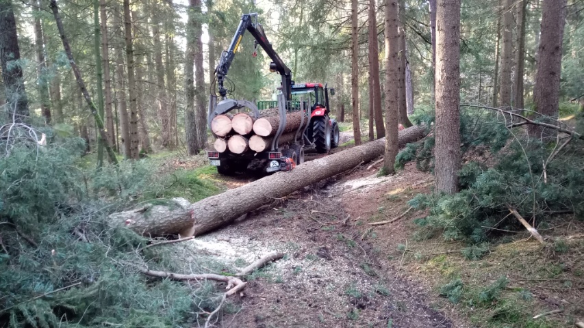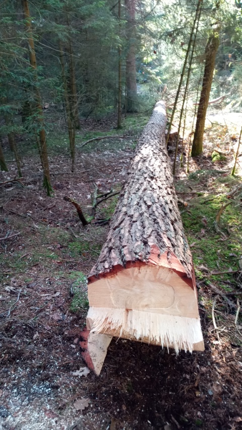 Vielleicht wurde während der Baum am Fallen war, noch weitergesägt? Dann könnte sich ein ähnliches Bild zur Schnittführung ergeben. Habe mal bei einem Kollegen mitgearbeitet, der hat das so praktiziert. Der Baum war zu Beginn des Fallens noch "geführt" und wurde während des Fallens dann "totgeschnitten".