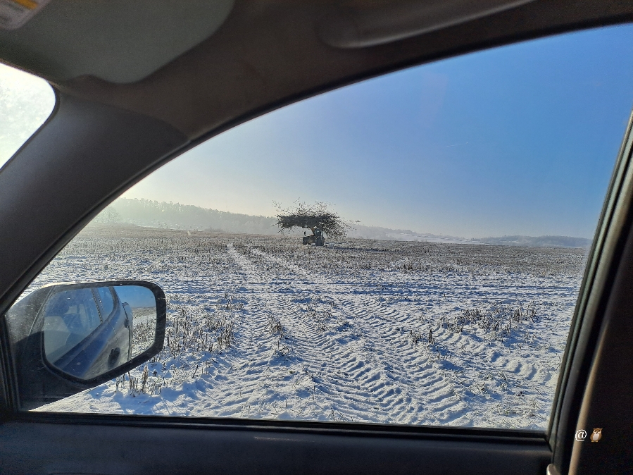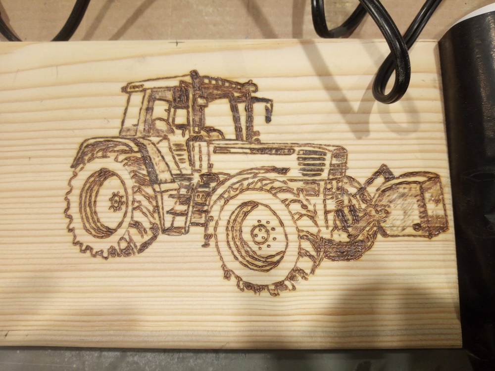 Ich glaube nicht, dass er es mit einem Beamer aufs Holz projiziert hat und dann gebrannt. Denn die Fendt-Kabine auf dem letzten Foto ist ihm in den Proportionen etwas verrutscht.