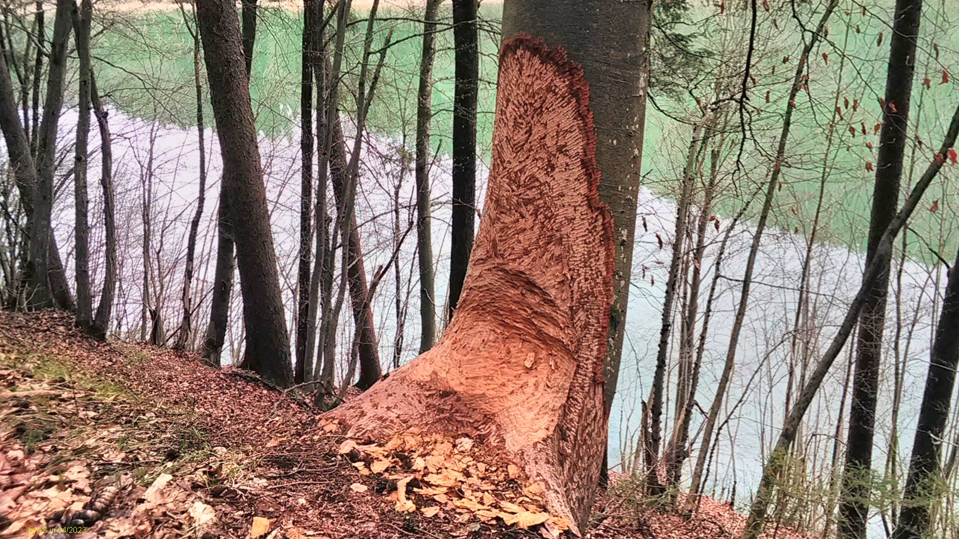 (da hat wohl ein mächtiger Bursche - die Fraßspuren gehen knapp 1 m hoch - versucht, eine dicke Buche zu fällen)