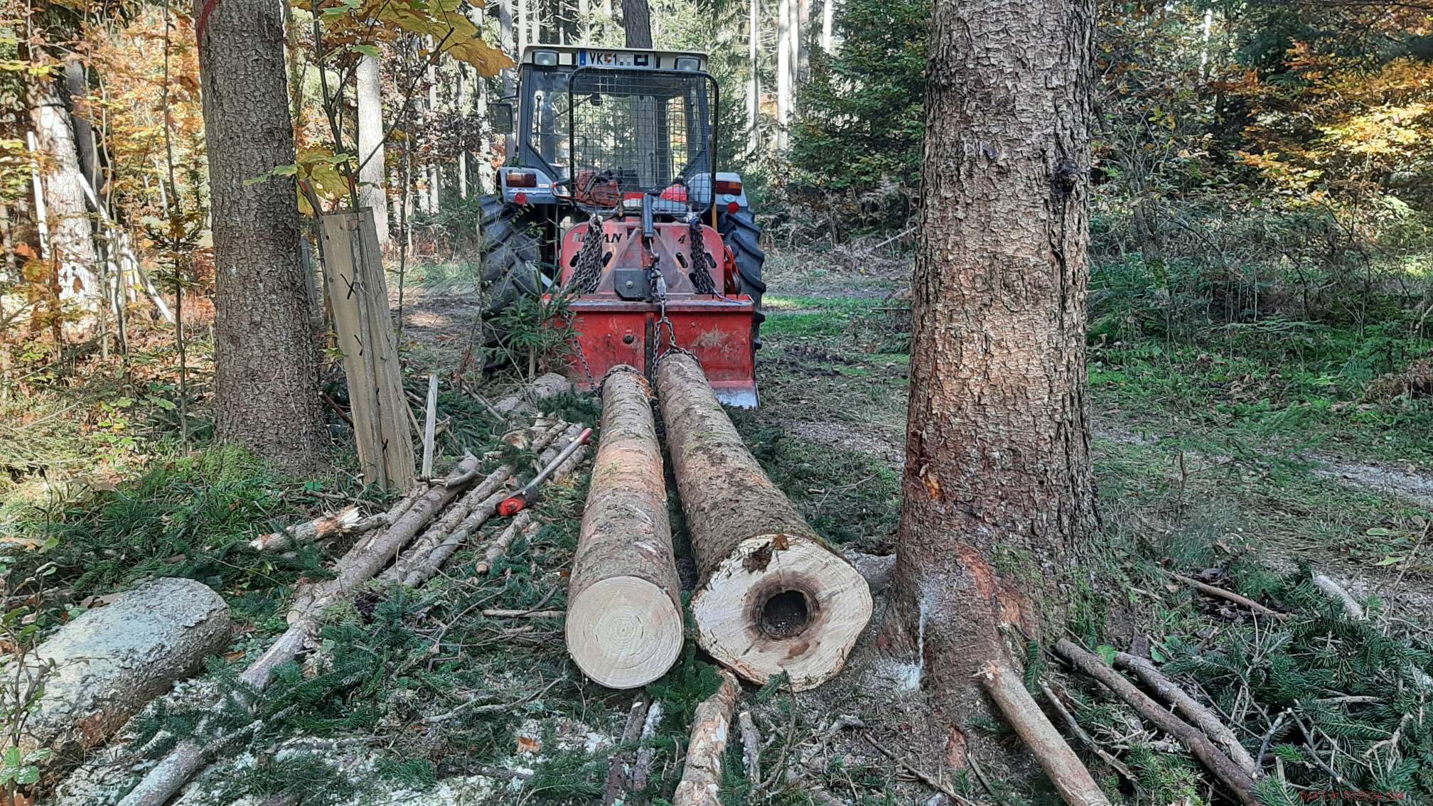 Um bei Falkes Fichten zu bleiben. Beide sind sicherlich weit mehr als 2m faul. Bestenfalls geht da bei der einen Fichte nach mehreren Metern eine Fixlänge ins D-Sortiment, bevor dann noch schätzungsweise max. 2 Fixlängen gesundes Holz nachkommt. Das D-Sortiment hat 25 - 30 % Abschlag. Falkes Fichten haben nach meiner Ansicht weniger als einen Fm Volumen. Was kommt da an Einnahmen zusammen? Ein paar €.