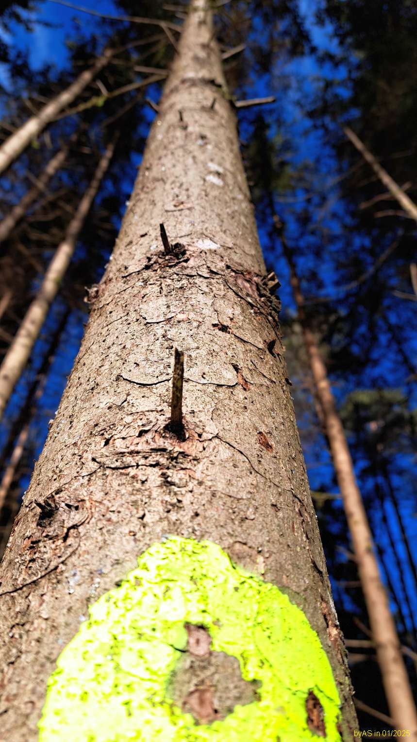 Paar hundert Meter weiter stehen beim Nachbarn Dutzende solcher Stangen, wo sich ein Befall erst im Spätherbst durch Rindenabfall gezeigt hatte. Der Förster hat schon alle markiert - es passiert aber nix. Ich warte noch bis März oder April, dann muss ich da wohl Druck machen!