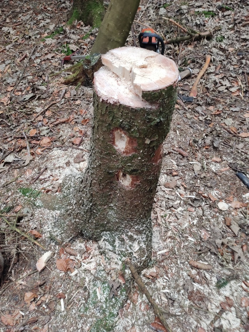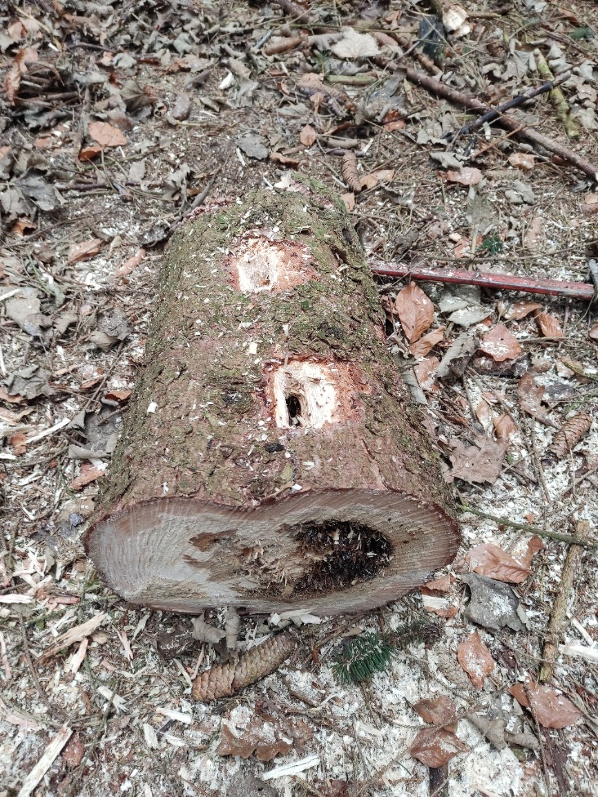 Wenn ein Stamm direkt am Boden liegen bleibt für einige Zeit, kann es passieren, dass die Sonne die Oberseite schon so weit trocknet, dass die Käfer den Löffel abgeben. Aber an der feuchten, kühlen Unterseite, die Kontakt zum Boden hat, reifen sie munter weiter bis zum Ausfliegen.