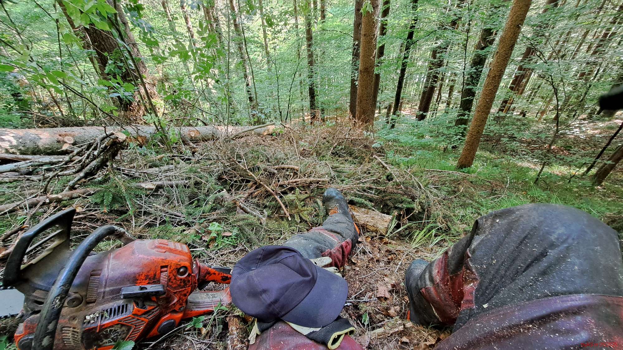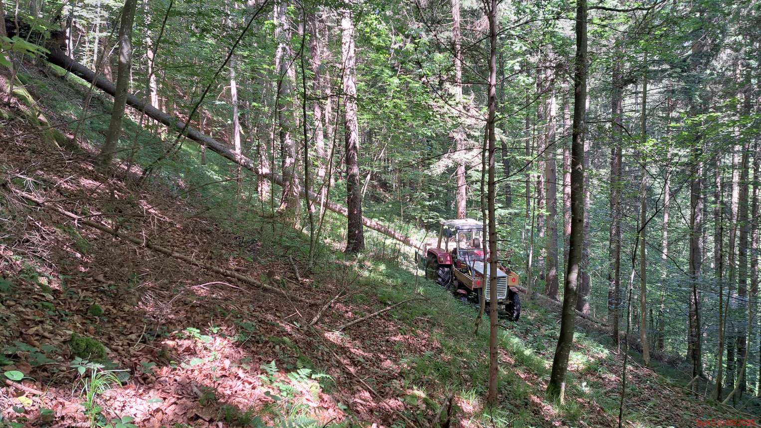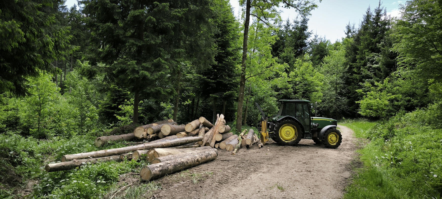 Der Kran hebt eine frische Fichte mit 4 m Länge und 40 cm MDM - aber nicht, wenn die Arme ganz ausgestreckt sind.