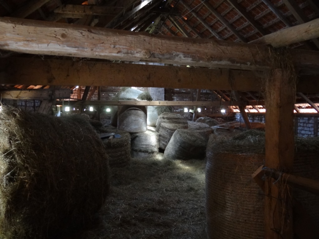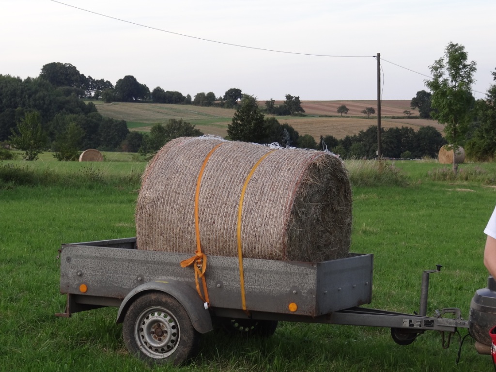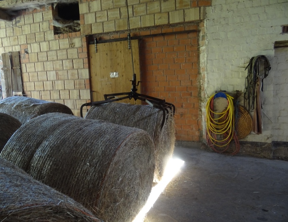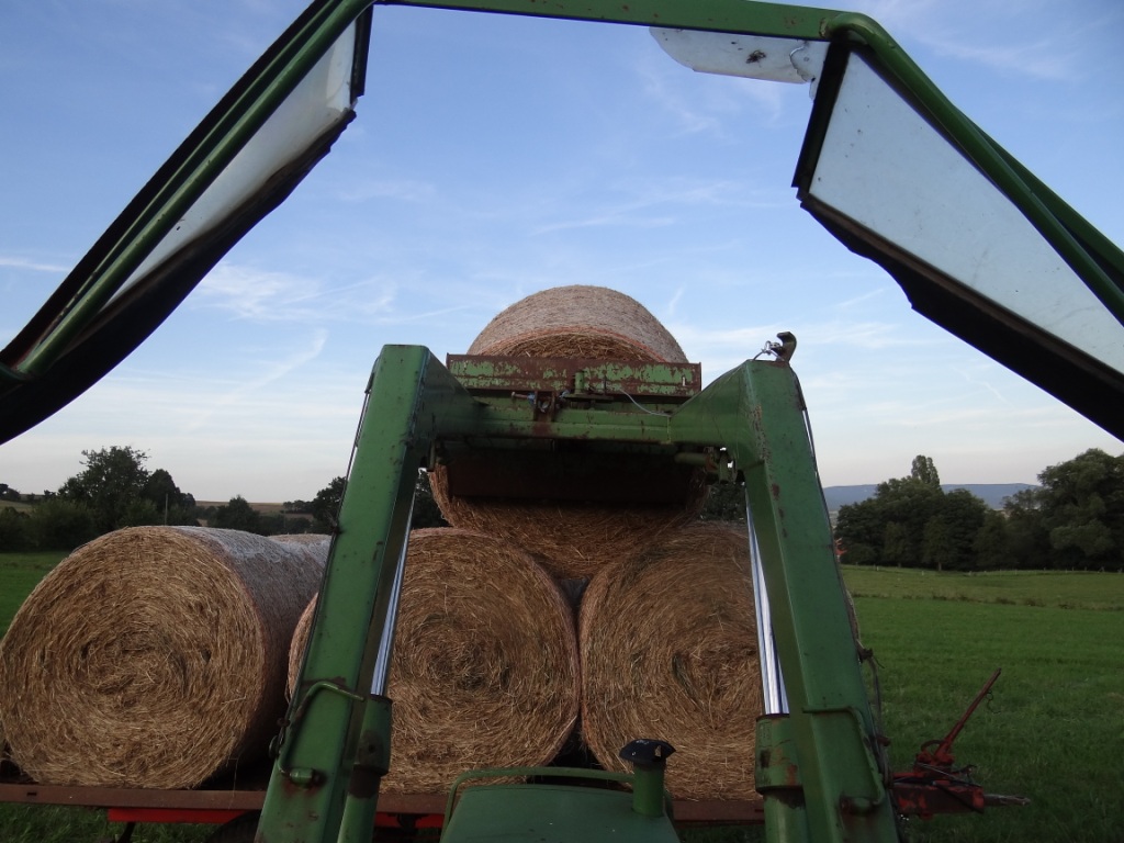 Die Ballen haben 1,25m Durchmesser, die kann man noch recht schön alleine kugeln, darum machen wir sie auch nicht größer. Vom Heuboden aus kann ich das Heu durch eine Klappe direkt in die Heuraufe werfen, die im Stall steht, da hat man nicht mehr viel zu tun.