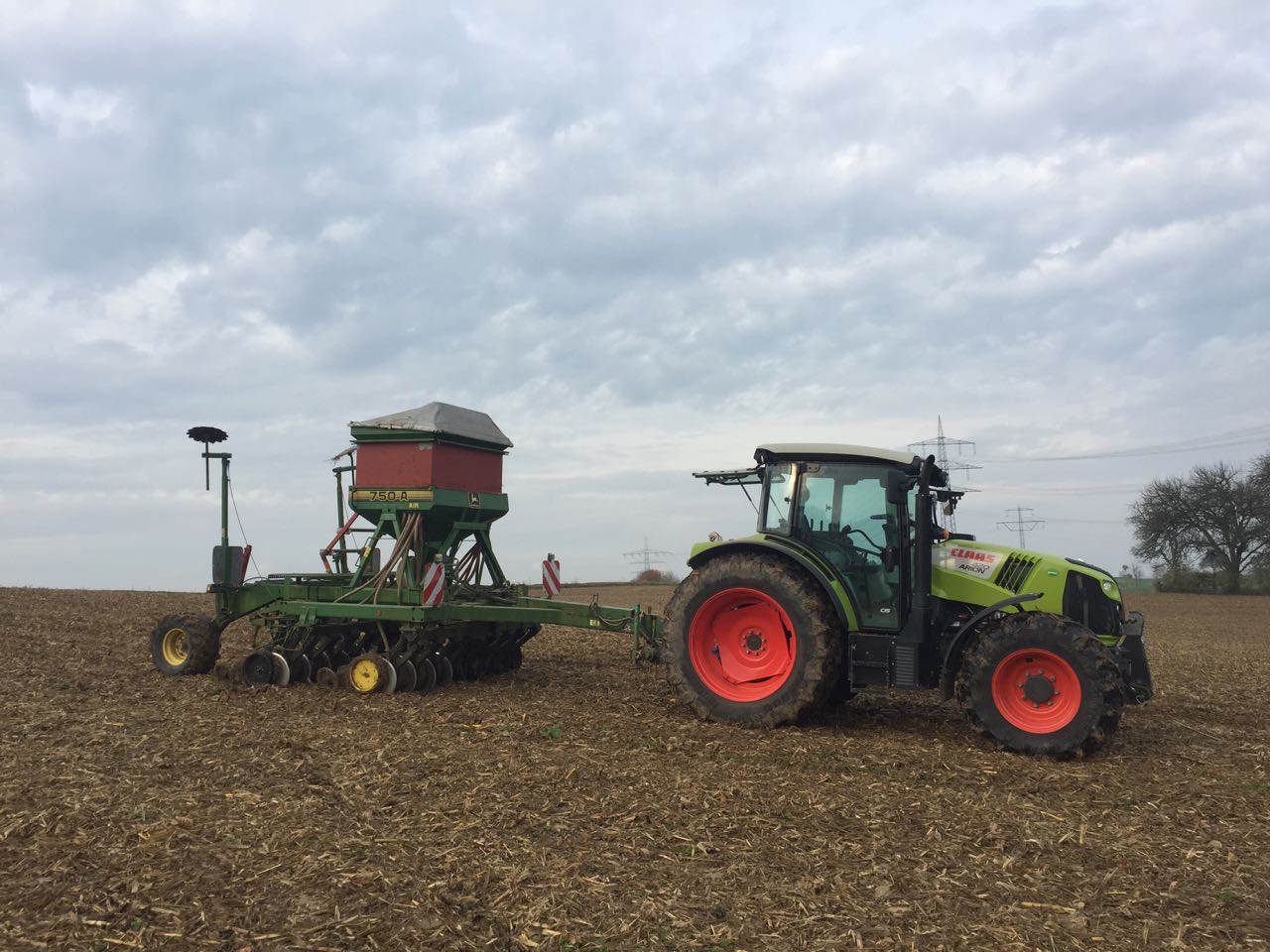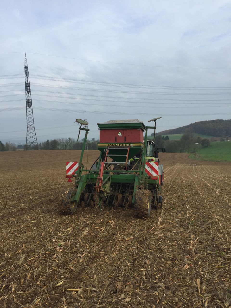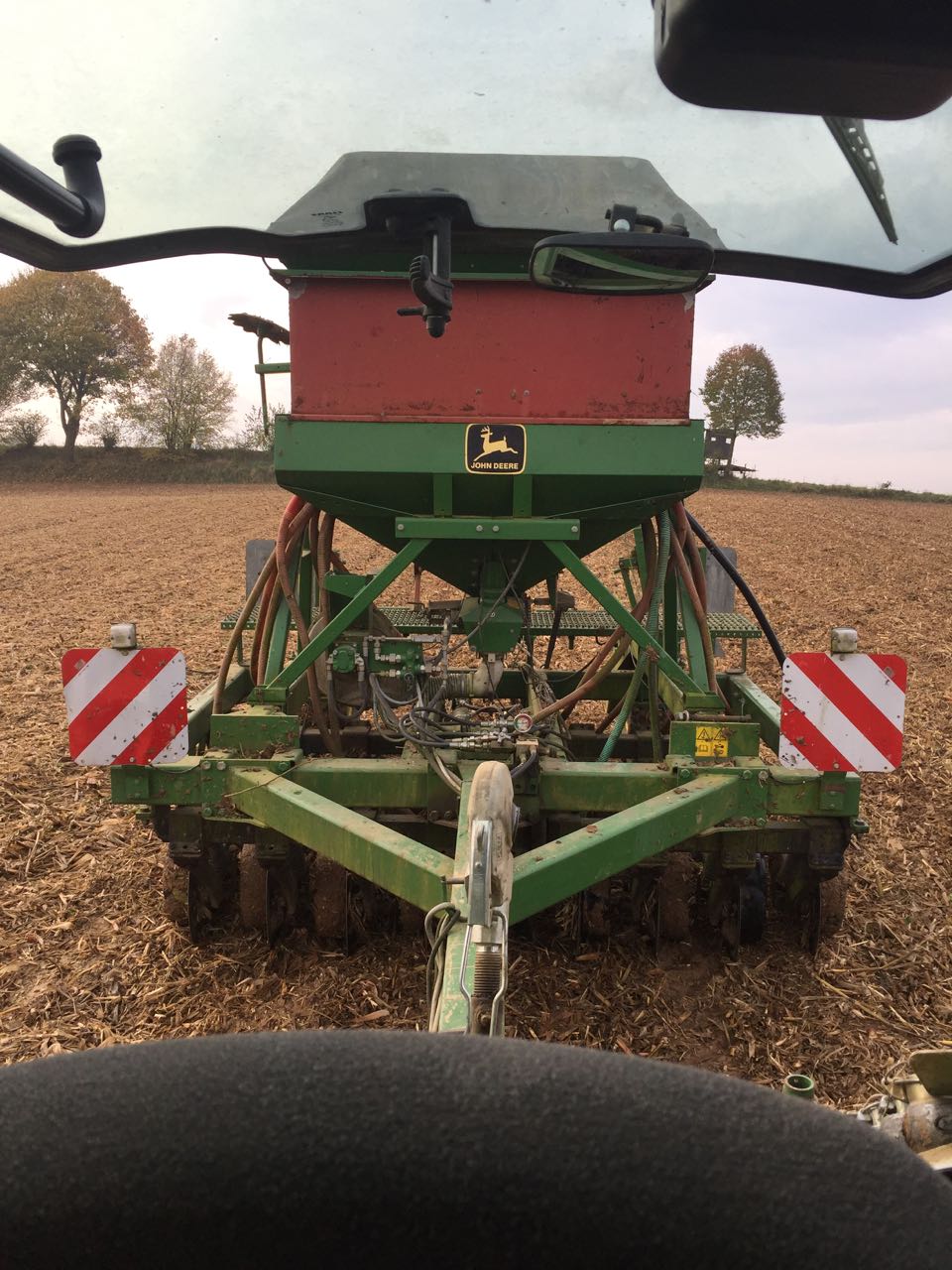 Vorfrucht war Körnermais, die Stoppeln wurden abgemulcht. Die Ackerbohnen wurden auf 8 cm Tiefe gesäht. Die Maschine gehört einem Kumpel. Ich werde einen Versuch mit Weizen damit machen, im Frühjahr soll Soja in Grünroggen damit gesäht werden. Die Maschine bringt genug Druck auf die Schare, so dass man sie voll beladen auf festem Untergrund komplett ausheben kann.