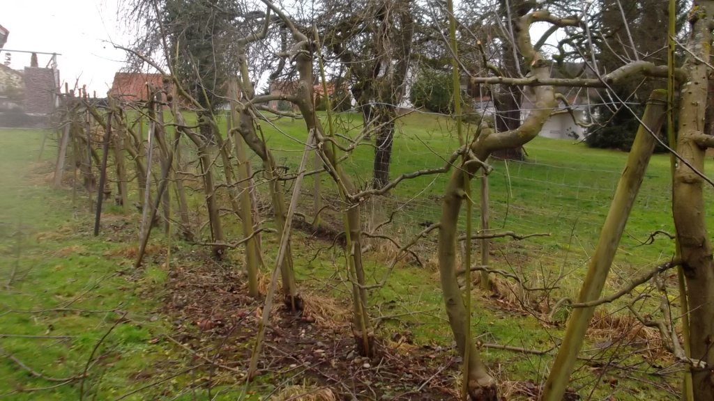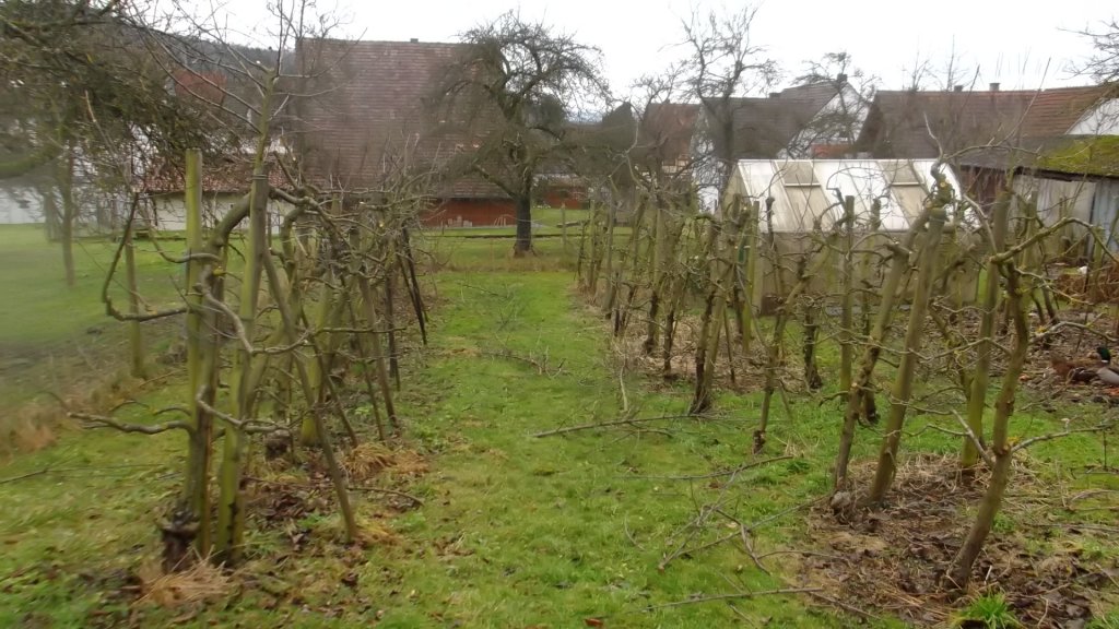 Jetzt sieht es in etwa so aus, 2 von 6 Apfelbäumen radikal ausgedünnt. Im Anschluss kommen noch einige Steinobstbäume und eine kleine Birne, wobei ich am überlegen bin ob ich diese nicht direkt über dem Boden verjüngen soll