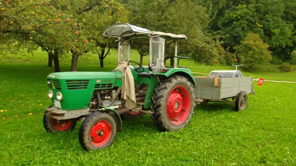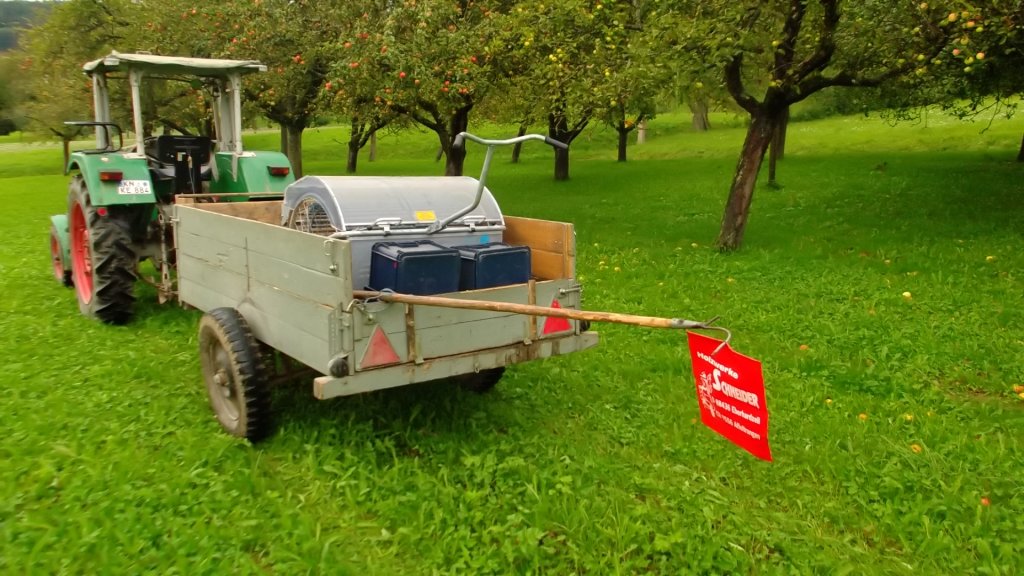 Weil ich den Thread gerade entdeckt habe, abe ich auch mal drei Bilder von mosten letzten Herbst, habe zwar keine solche Technik wie manch anderer hier, für unseren 600l + ca. 300 Lohnpressen reicht das aber allemal.