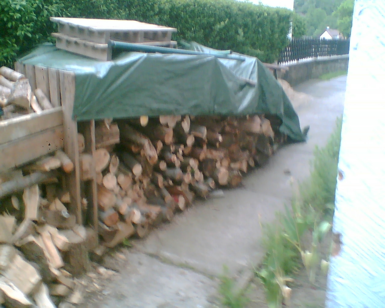 Wenn ich Windbruch bekomme sieht das anders aus, weil das noch nass/grün ist, dann wird immer gleich auf 50cm gesägt und gespalten. Ich lasse das Holz immer 2 Jahre im Garten liegen (siehe Bild), dann wird es im Frühsommer geschnitten und gespaltet, und kommt für den nächsten Winter in den Holzschuppen. Der ist gut durchlüftet.