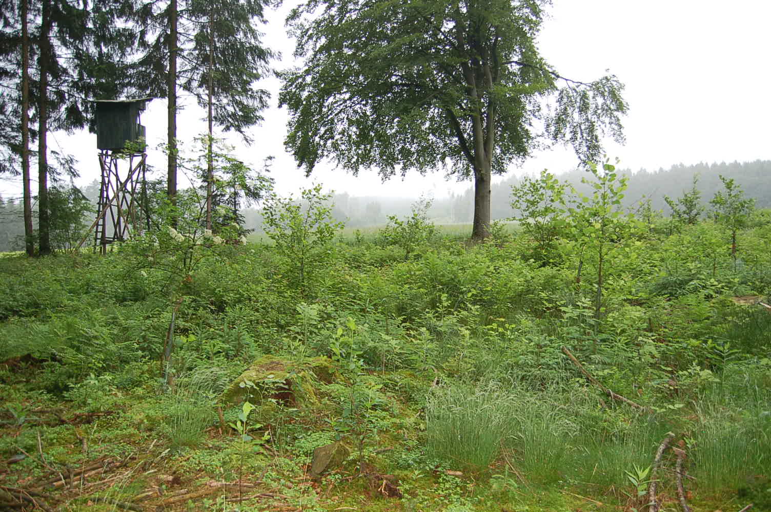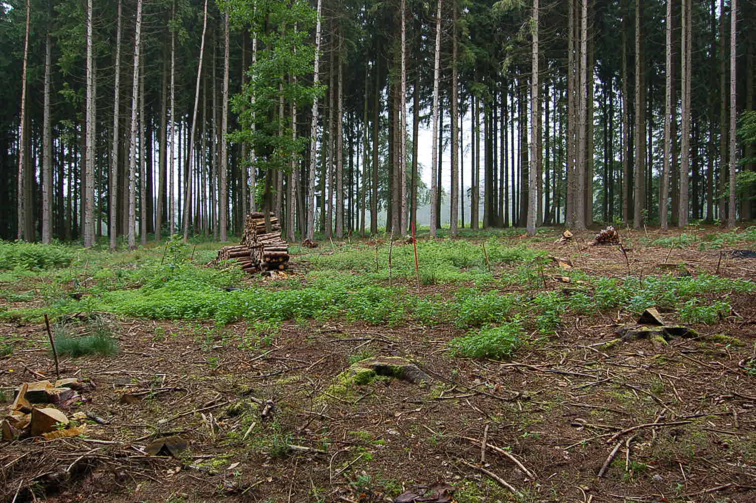 Windwurf- und Käferfläche in Wald 1, die 2005 mit Roterlen angesetzt wurde