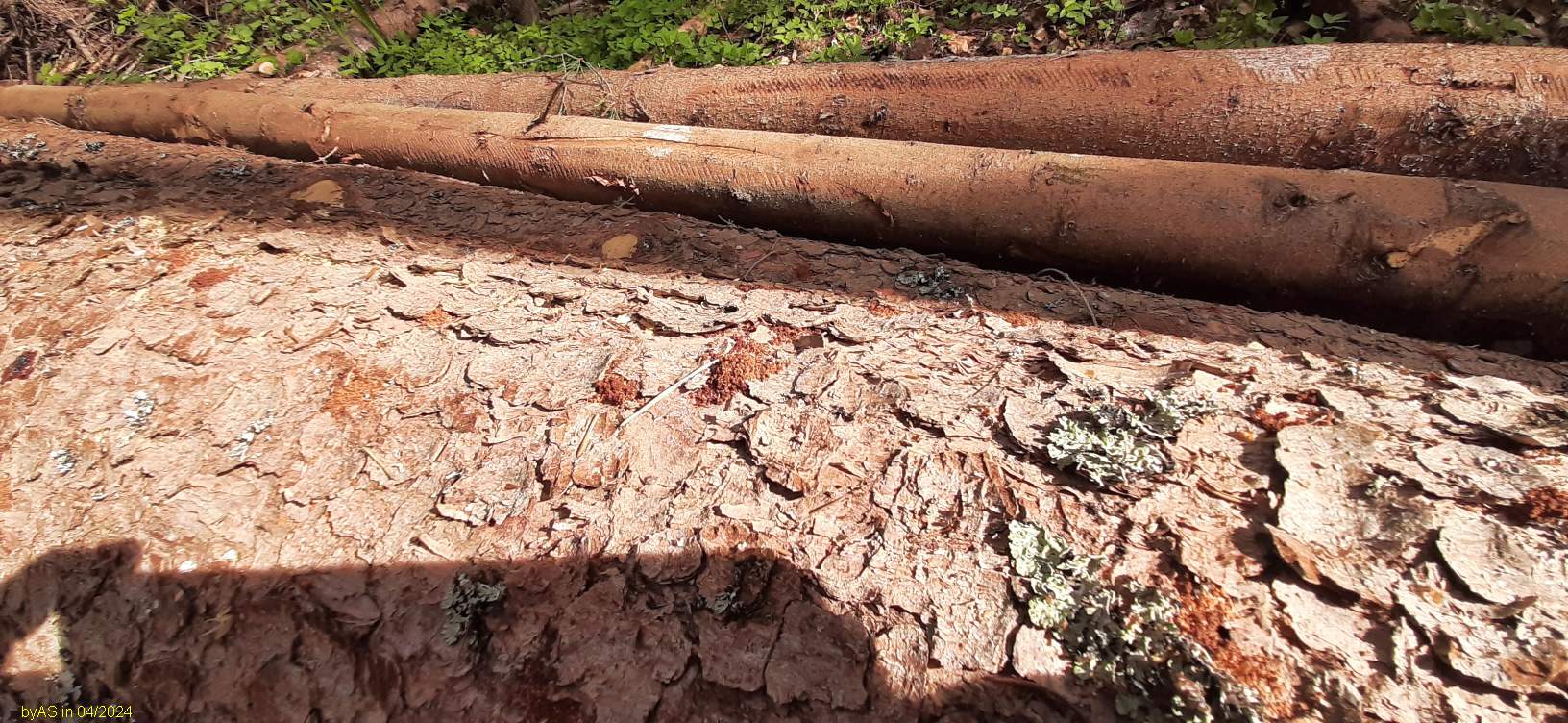 Liegendes Schadholz wurde alles aufgearbeitet (November) und hab die Äste, die im nassen Winter nicht abtrocknen wollen, kurz kontrolliert. Selbst bei den dünnsten Ästchen waren Kupferstecher drin, somit nach Bohrmehl an den Bäumen gesucht. Bei einer stehenden Zwiesel-Fichte wo ein Wipfel fehlt, wurde ich fündig. Tippe mal auf extrem geschwächten Baum...