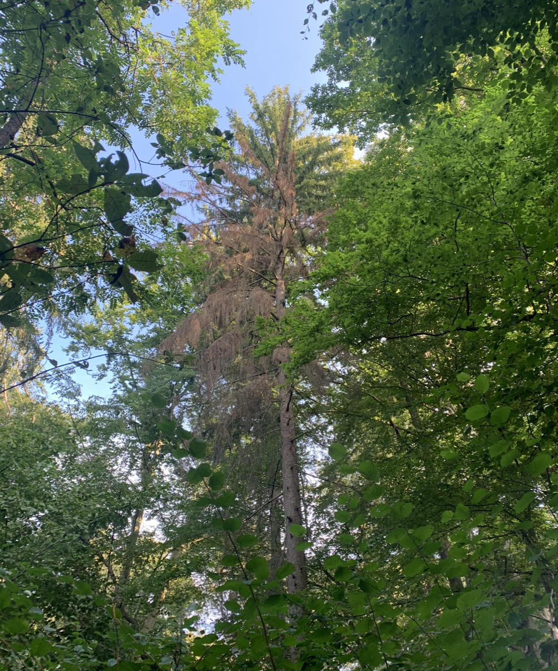 Die vermeintlich grünen Nadeln sind durch ihre Wachsschicht langsamer am Vertrocknen, als der Stamm schon gestorben ist.