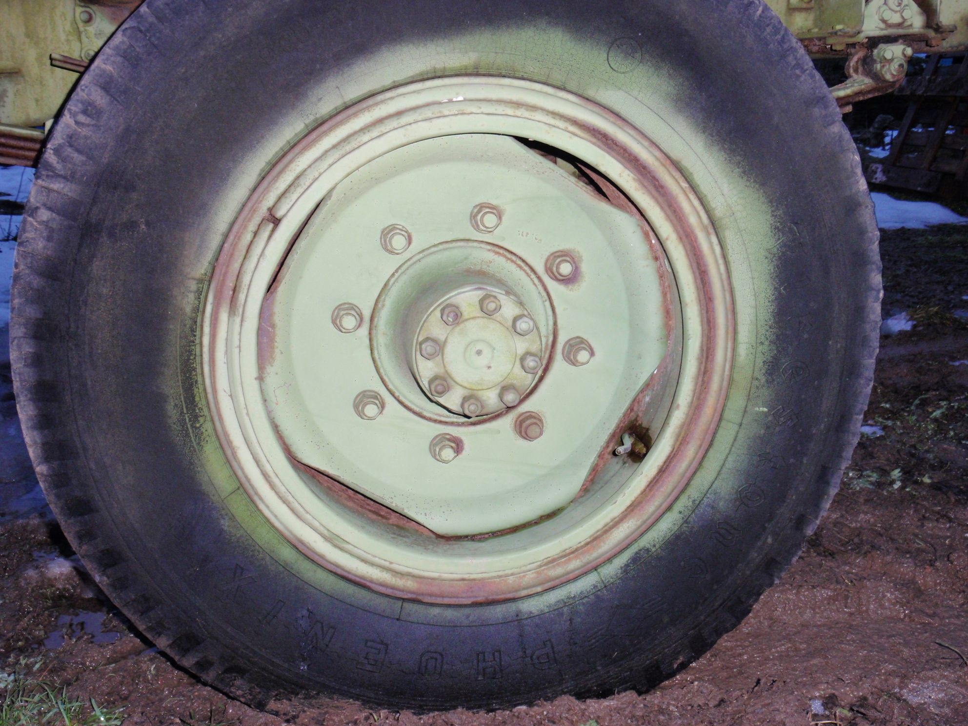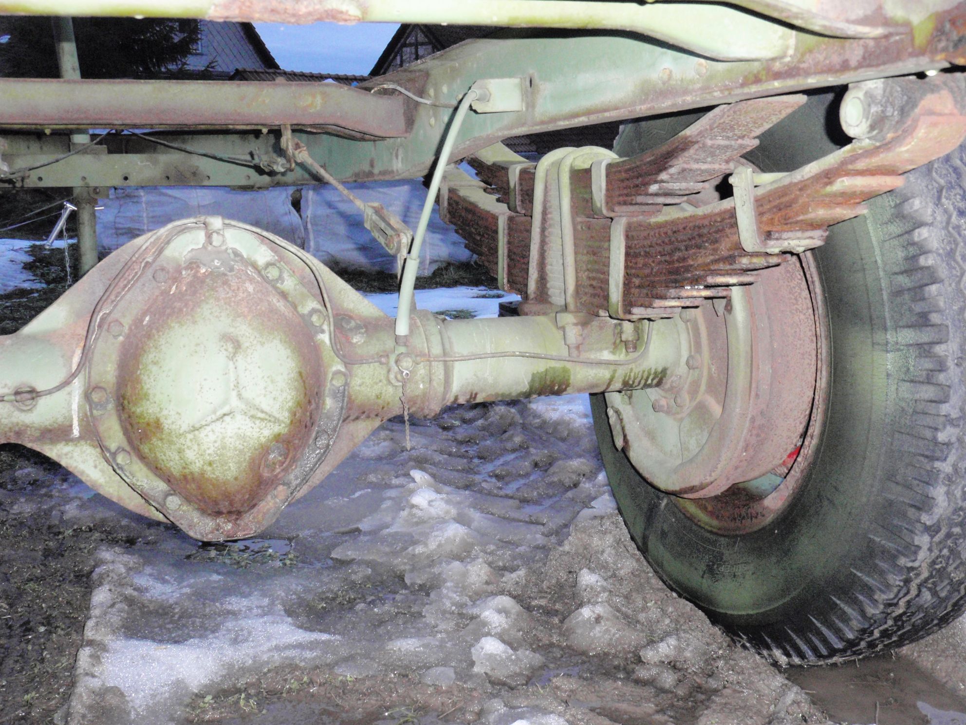 Ich habe einen halben Mercedes-LKW nach haus gezerrt, der ein Holz-Anhänger werden soll. Hinterachse mit Leiterrahmen (Logisch), Reifen 9.00/20, war wohl mal ein 15tonner oder so.