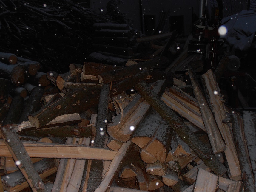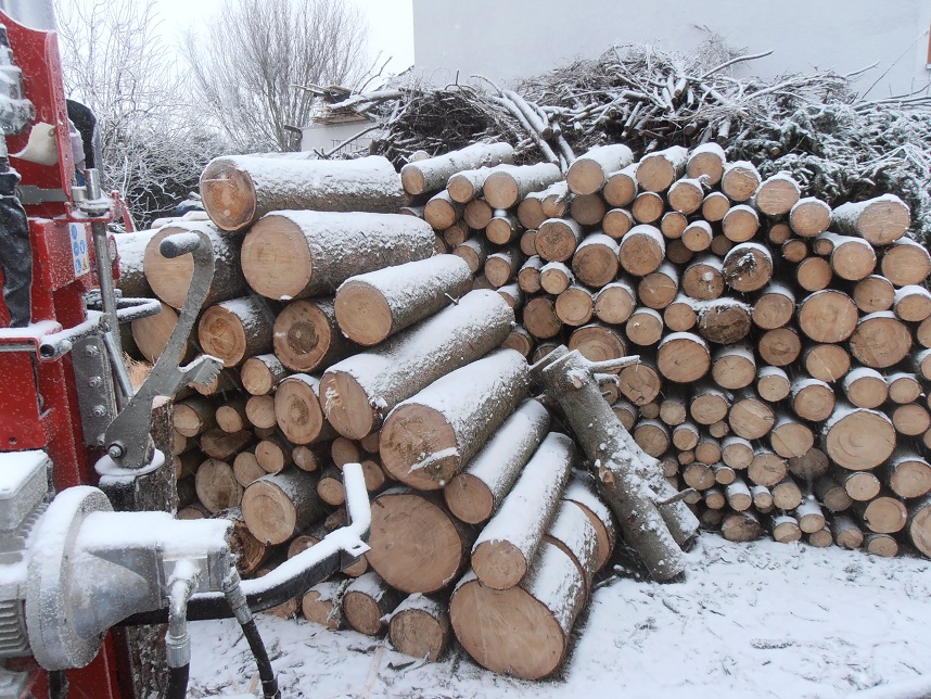 Polter liegt neben dem Spalter, ich schneid Meterrollen (Hurgel) ab, in den Spalter und auf den Stapel.